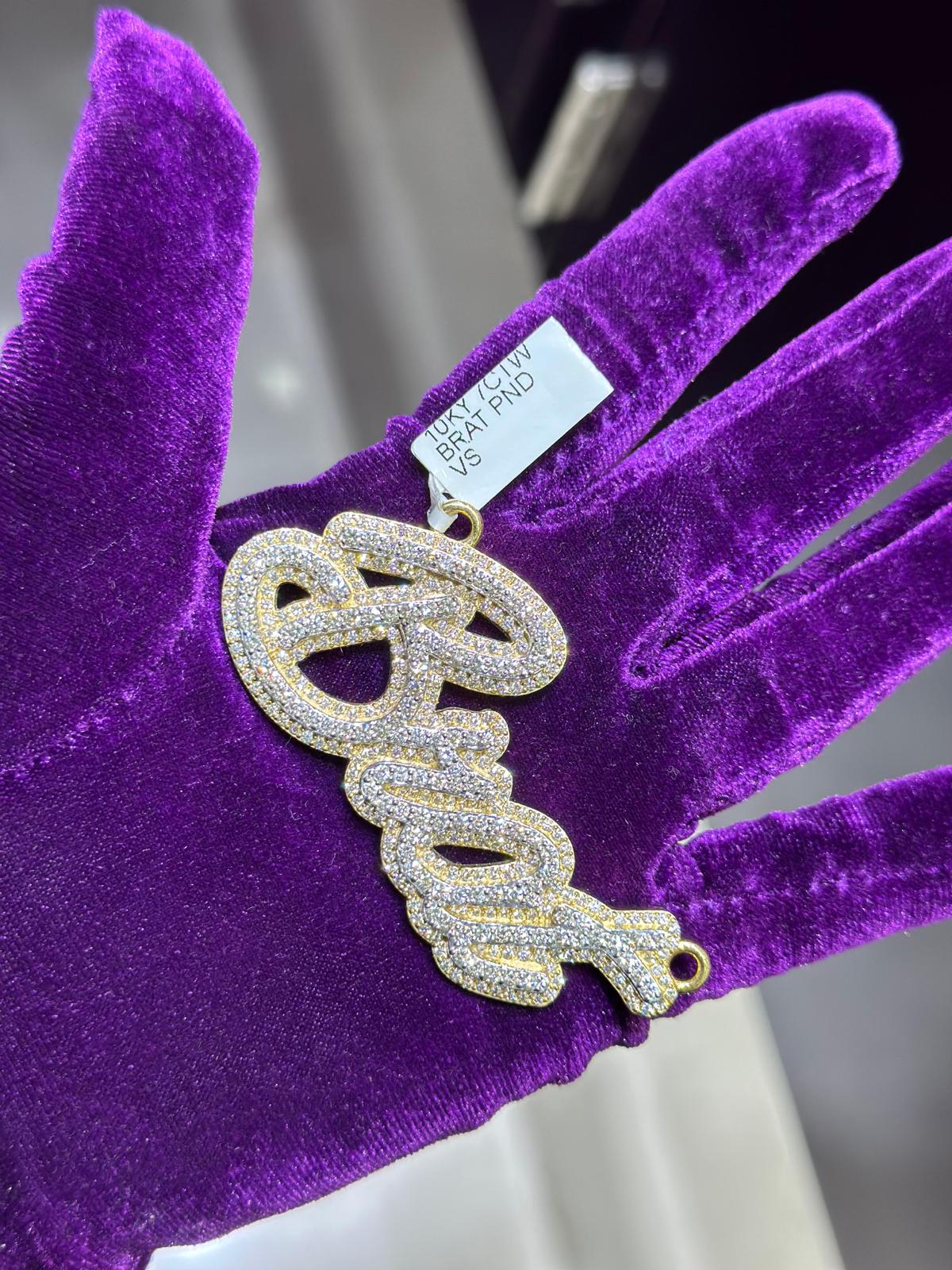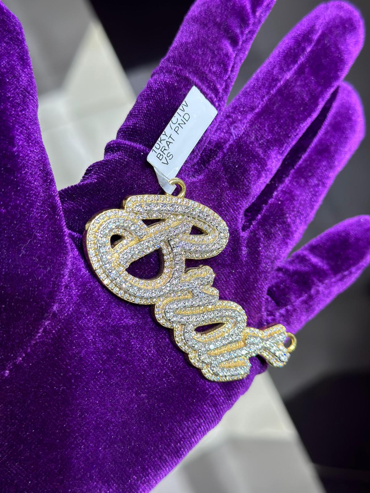 Elevate your look, make a bold statement, and celebrate your distinctiveness with the 10k yellow and white gold custom diamond "Brat" two-layer pendant. Seize the opportunity to express yourself in a way that's both luxurious and fearless. Your journey to owning this stunning masterpiece starts now. Contact us today to turn your vision into a reality and wear your attitude with unparalleled pride and elegance.
