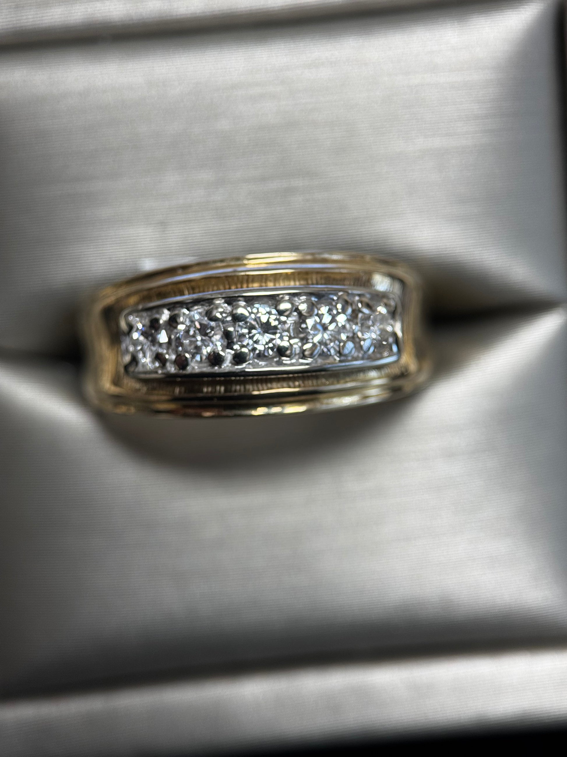 This Estate 14 K yellow gold ring (size 10) boasts a band of five diamonds (3.0 mm each) totaling .50 carats. Rated VS-SI in Clarity and H-I in Color, the diamonds are set in a polished mounting with decorative brushed areas on either end. Stamped with "14 K" the top of the ring measures 3/8" (North to South) and the row of diamonds measures 5/8" (East to West). Weighing 5.6 grams, this ring is in excellent Estate condition with no visible signs of wear, making it a must-have for jewelry enthusiasts.