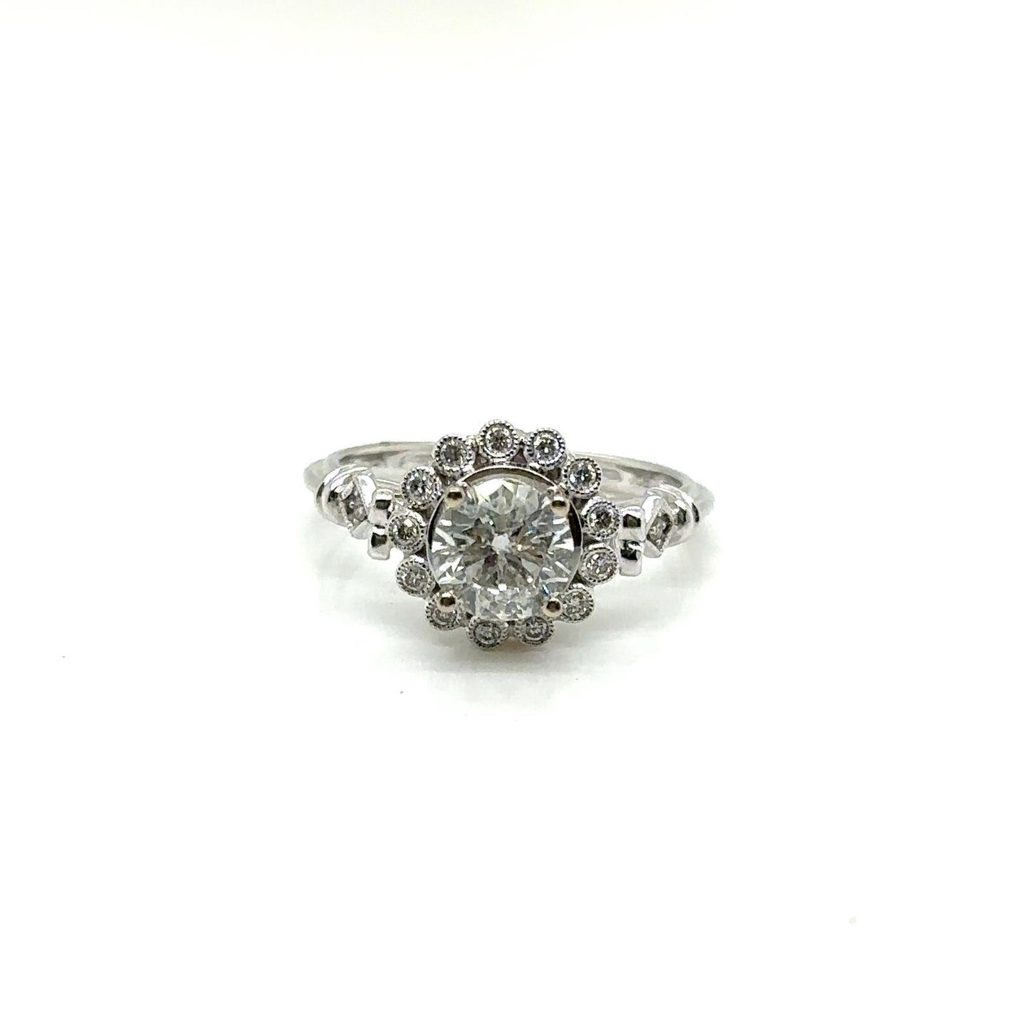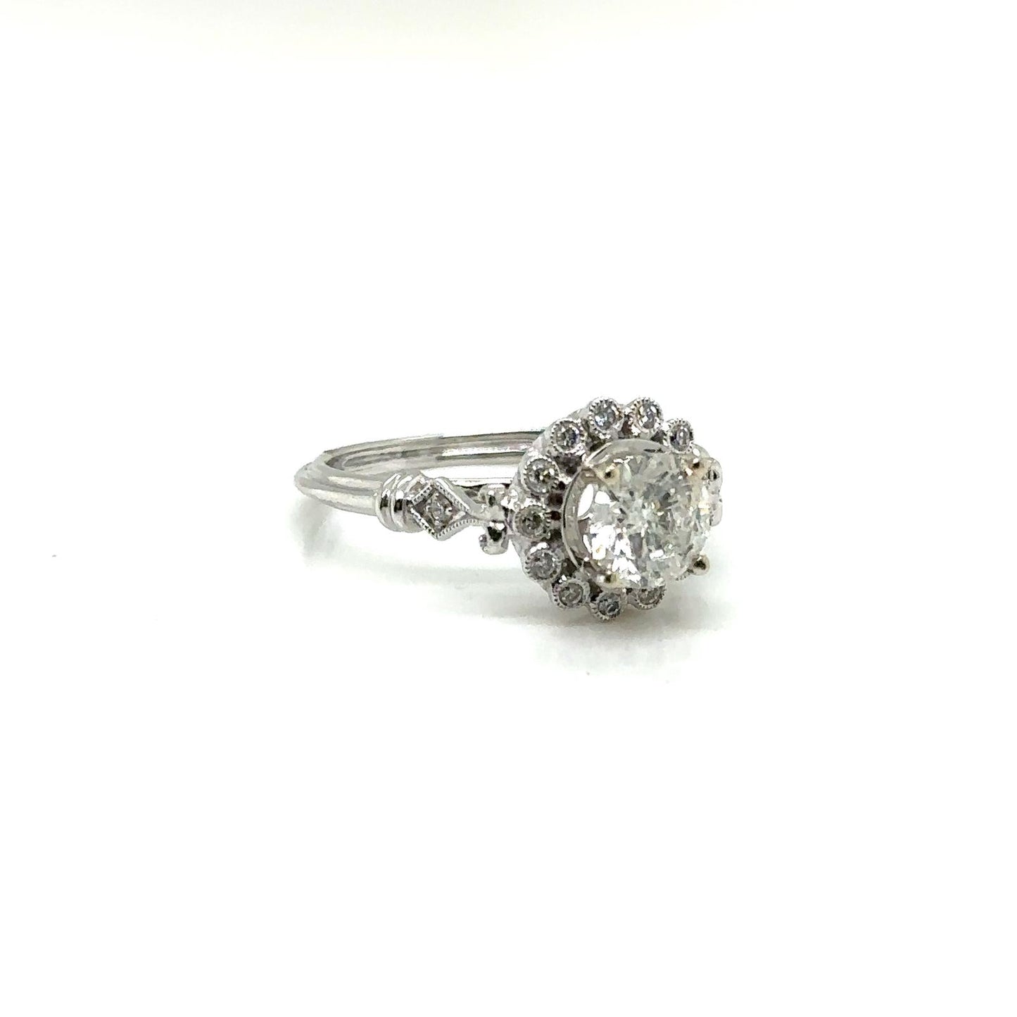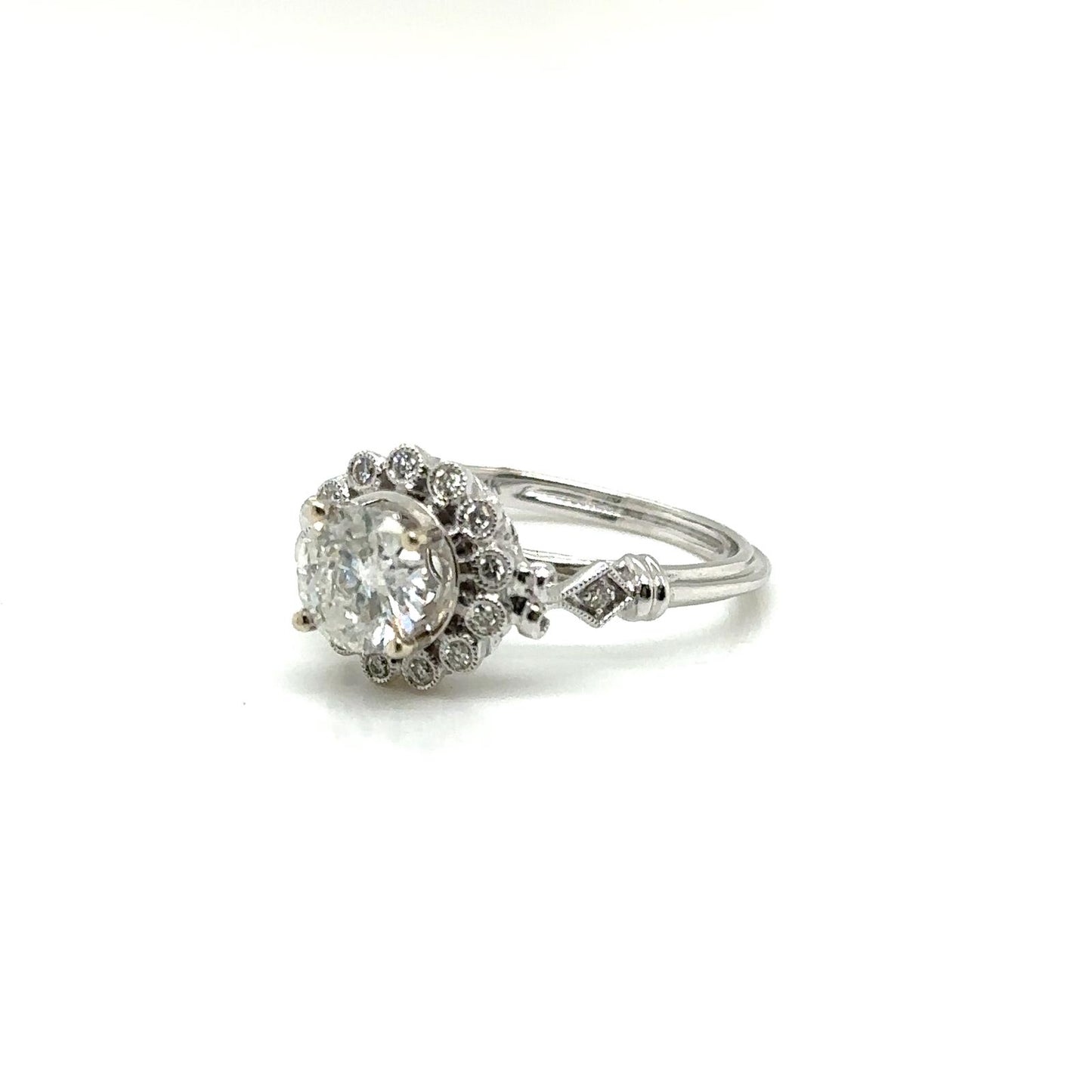 Show your love with an elegant 14k two-tone diamond engagement ring. Enjoy 1.25ctw of brilliant carat round-shaped stones, surrounded by a stunning halo of surrounding pave diamonds. This gorgeous ring is finished with a unique filigree milgrain design for timeless beauty and enchantment.