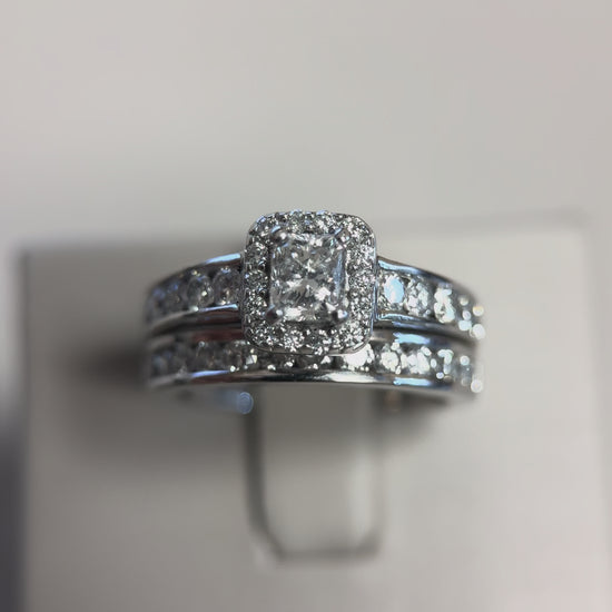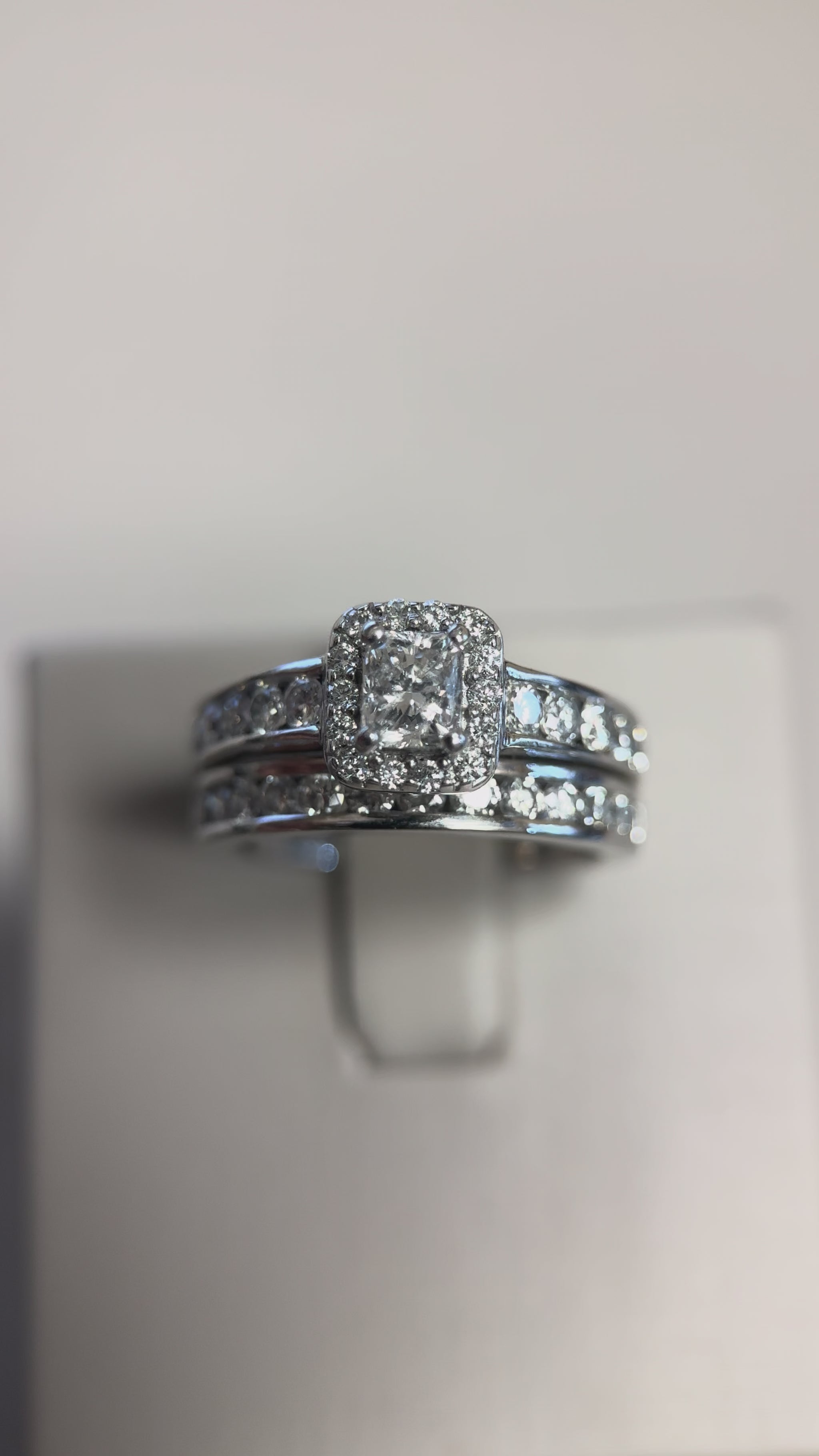 “Elegant 14K white gold halo wedding set with .46ct radiant diamond. Timeless brilliance, sparkling halo & band. Perfect for modern brides.”