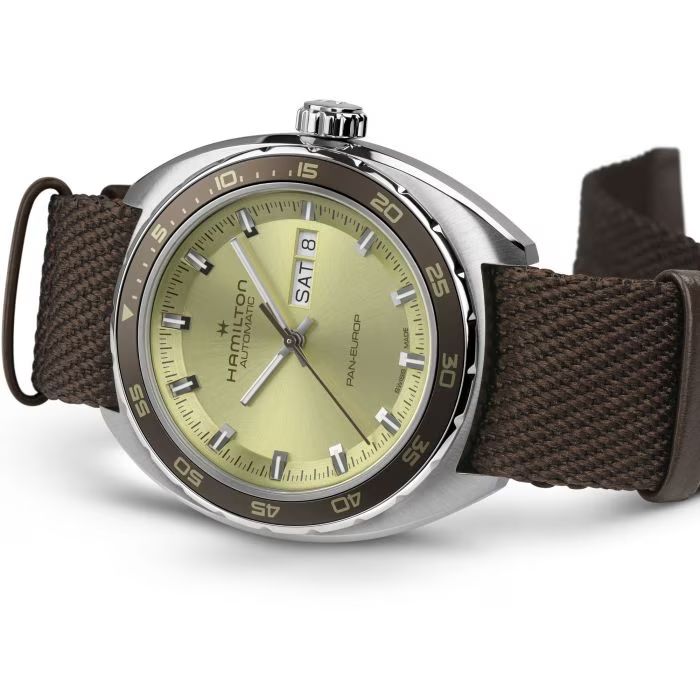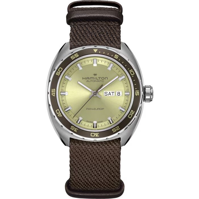 Race back in time with this 42mm Pan Europ Automatic, boasting a vintage-inspired design from the 1960's. Channeling a retro charisma suited for today's lifestyle, it features a cushion-shaped stainless steel case with a unidirectional rotating bezel. A reliable companion to win the race against the clock, the Pan Europ Automatic is equipped with the H-30 automatic movement sporting 80 hours power reserve. Two interchangeable strap options complete the look: a chocolate brown NATO woven textile strap and a sage green soft touch perforated leather strap, emphasizing the 1960’s racing feel.