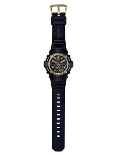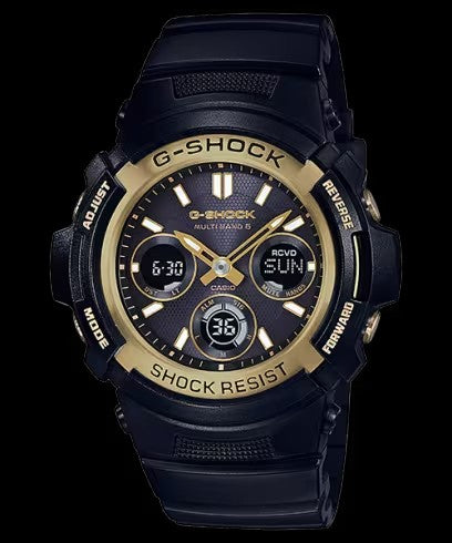 Popular digital-analog AWGM100 design. Whenever the analog hands interfere with reading of the digital display, simply press a button and the hands move out of the way for a clear view. Metal embedded in the resin of the band enables light weight along with plenty of strength.