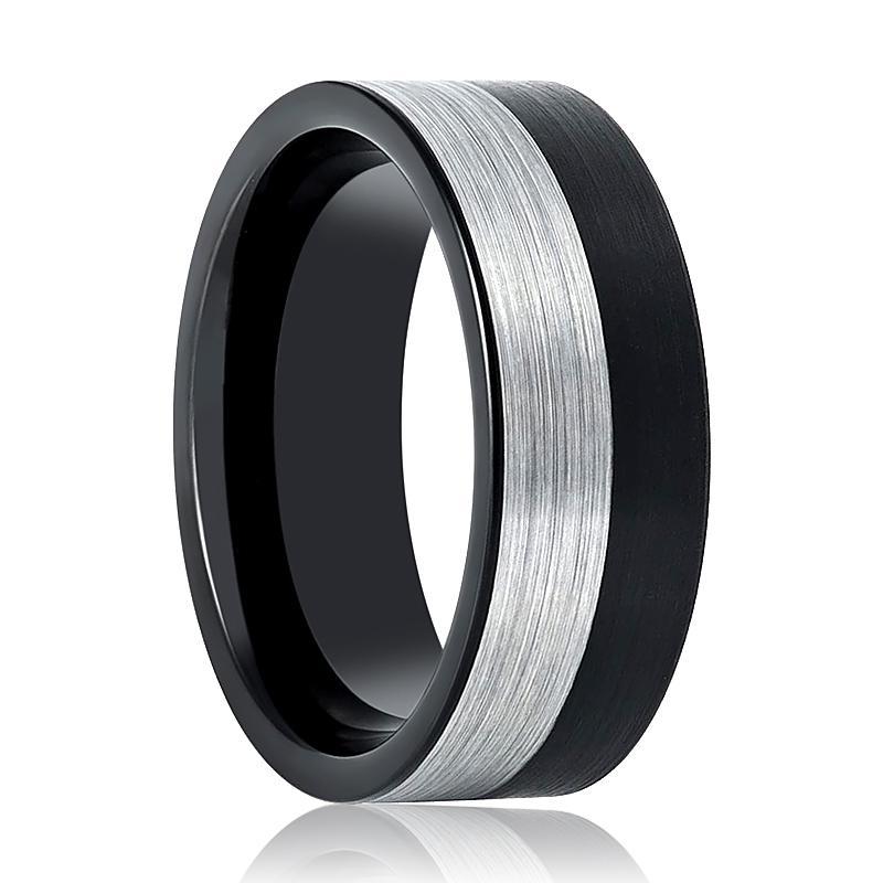 Tungsten Mens Wedding Band Two Tone Silver & Black Brushed 8mm Tungsten Carbide Ring