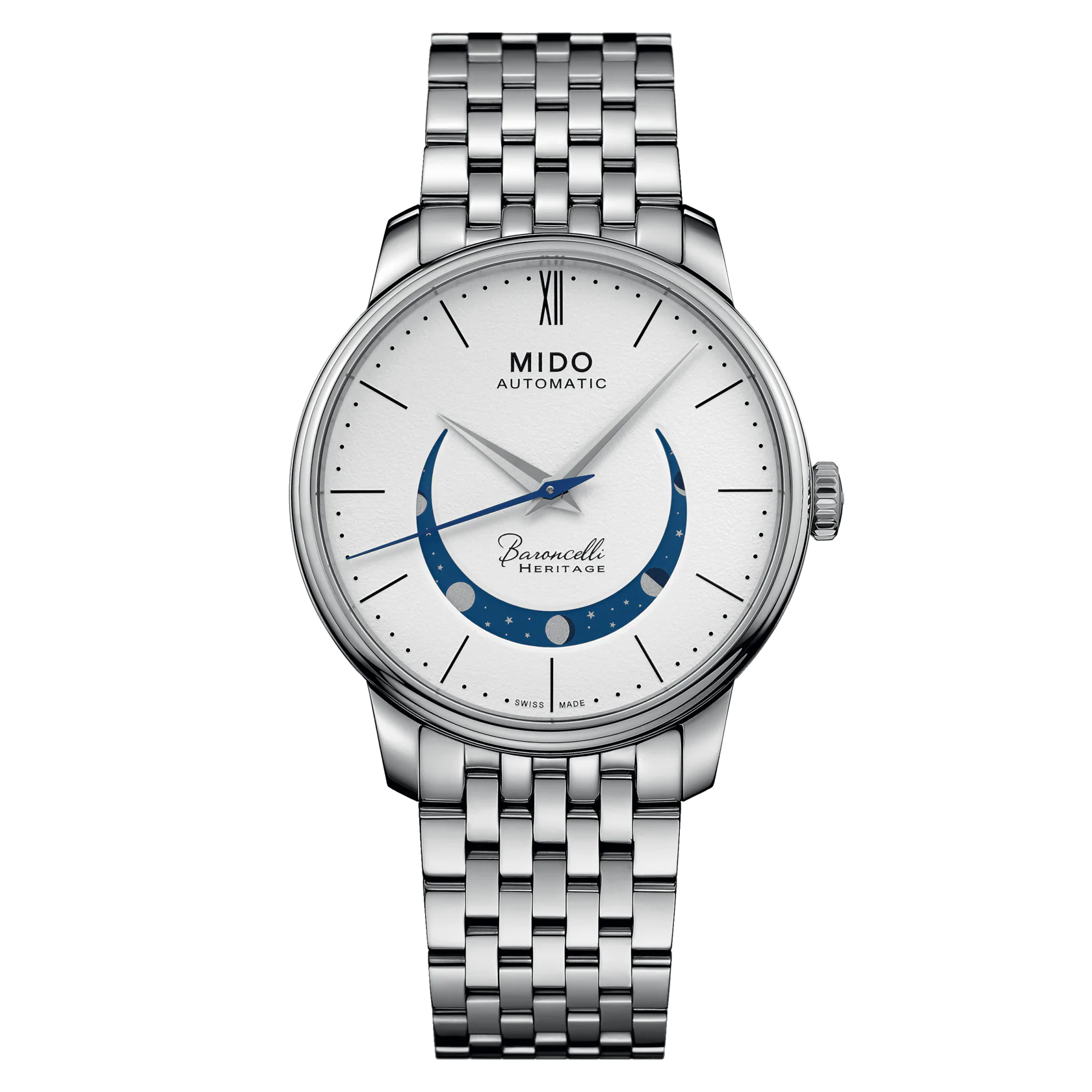 The new Baroncelli Heritage Smiling Moon Swiss watch reach for the moon, displaying it on our wrist with elegance and exceptional slimness. The phases are presented in a highly original manner, through a wide smile on the dial. The extremely pure of this classical model grained dial is juxtaposed with the radiant polished steel of the case and link bracelet. Above all, it features an utterly unique moon-phase aperture, where a rotating disc reveals the eight main phases of the Earth’s satellite in a star-studded sky. Behind the scenes, this magical sight conceals a highly accurate Mido automatic mechanical movement at work.