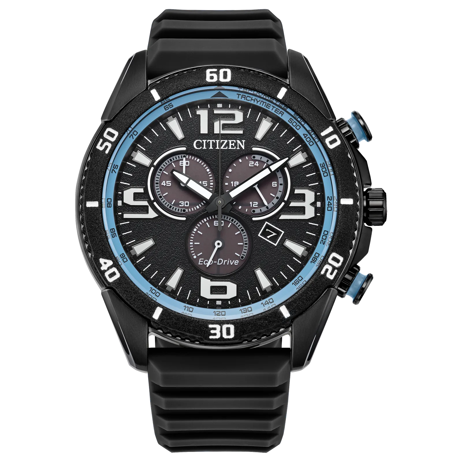 The sporty styling continues on the dial, with lume-filled, highly legible hour markers anchoring the look, while a light blue tachymetric scale outlines the display. Advanced functions include a 1-second chronograph measuring up to 60 minutes, 12/24 hour time, and a date indicator at 4 o'clock. The men’s high-performance Brycen is sustainably powered by any light with Citizen's proprietary Eco-Drive technology that never needs a battery. Water resistant up to 100 meters. Caliber H500.