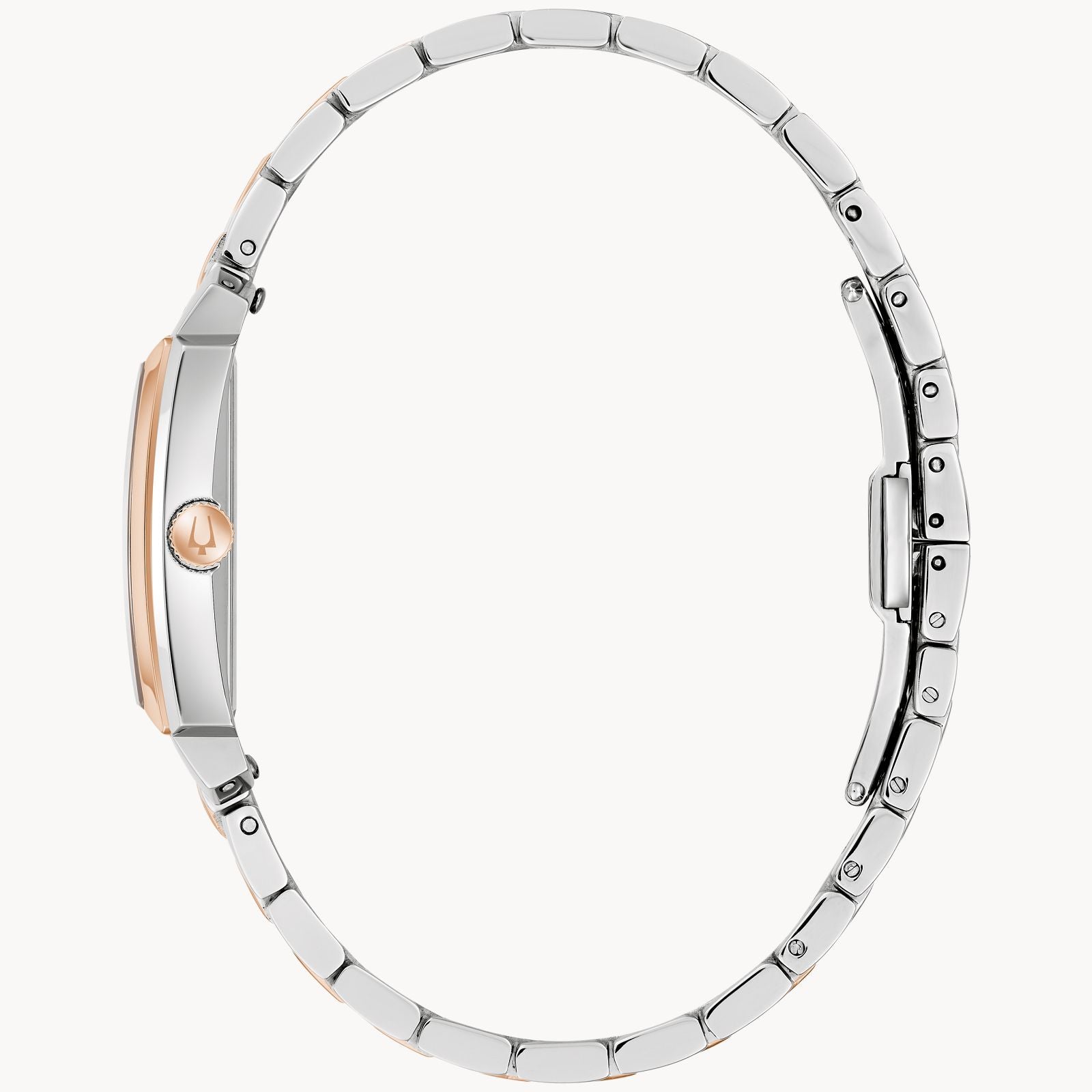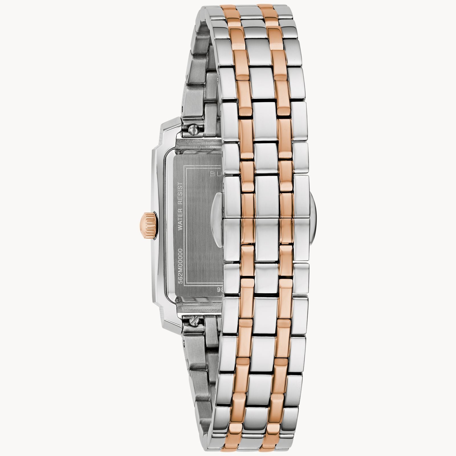 Embrace a refined elegance with this impressive Bulova women’s timepiece from the Sutton collection. Distinguished by a rose gold- and silver-tone stainless steel rectangular case, the watch features a mineral crystal and a finishing that dazzles in the light. The brilliant white enamel dial is accented with applied rose gold-tone numerals and hands for a look of true sophistication. A matching five-link two-tone stainless steel bracelet features a deployant closure with pushers for a perfect fit and latched spring bars for easy release. Experience an elevated sense of luxury with this Bulova ladies’ timepiece for the woman with an exceptional sense of style.