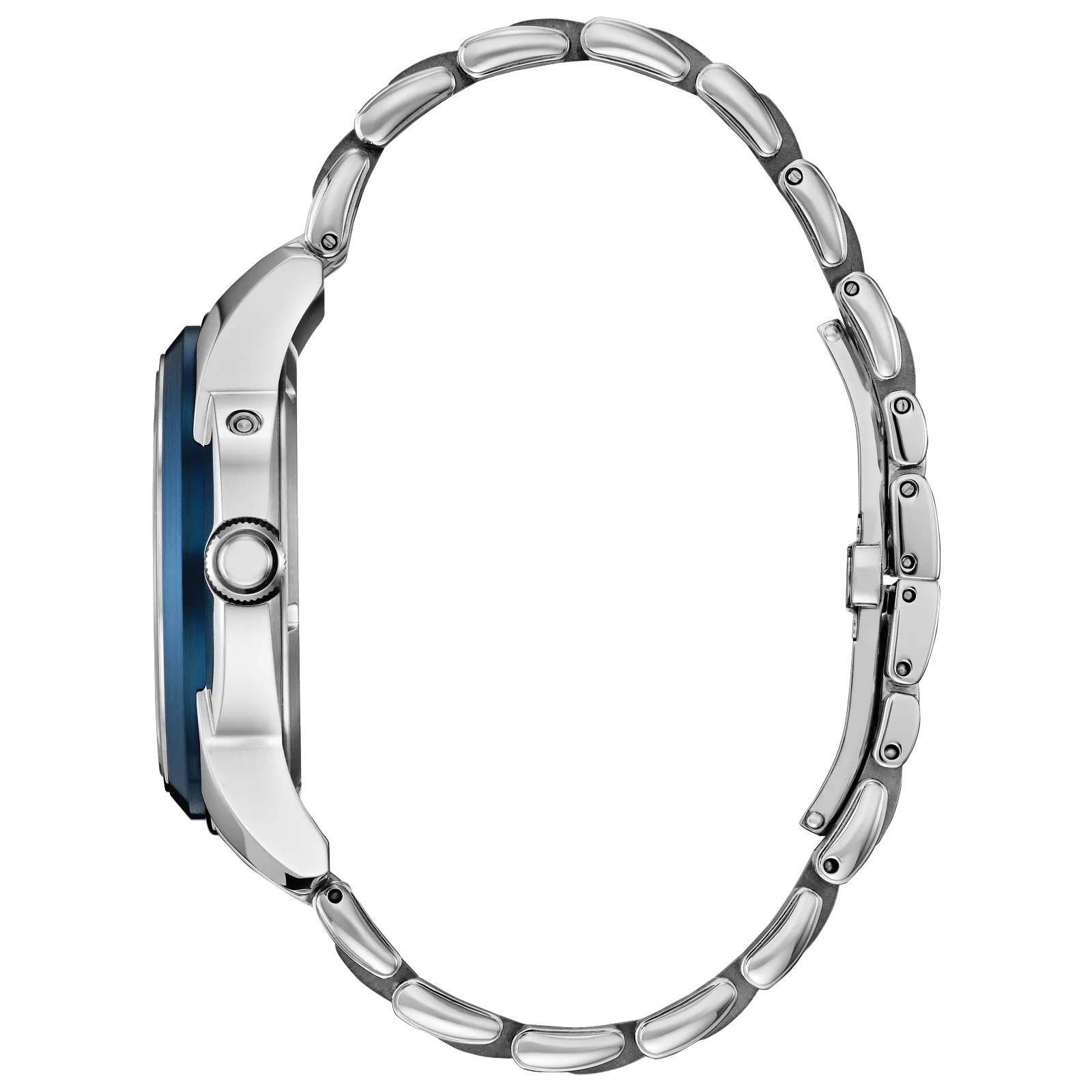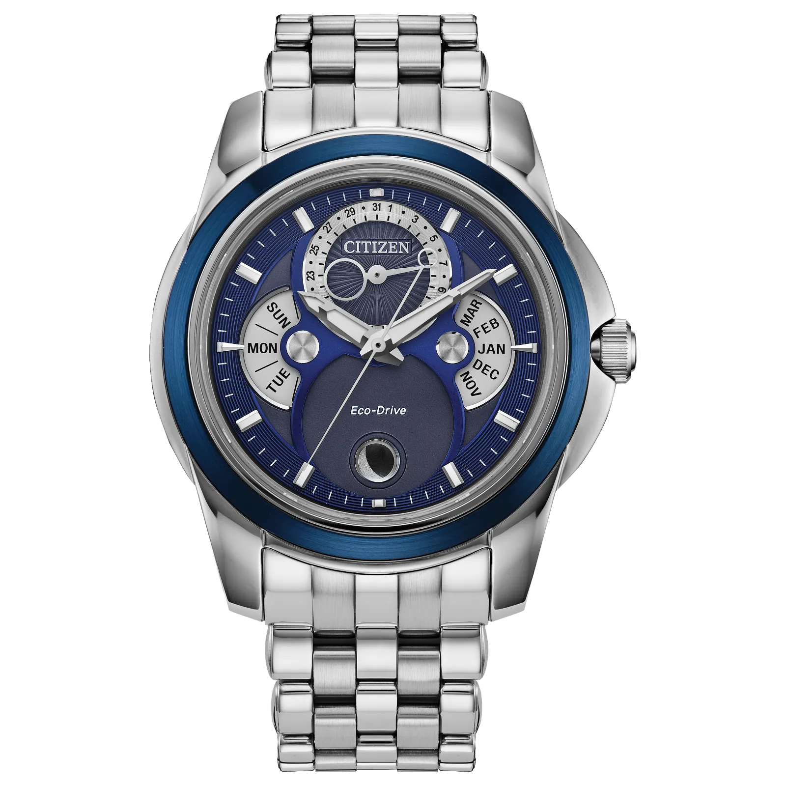 On the multi-dimensional dial, the watch features analog indicators for the month, day, and date and a moonphase indicator towards the 6 o'clock position, as tones of deep blue, white, silver, and gray add to the dial's charm. This men’s watch features Citizen's Eco-Drive technology – sustainably powered by light, any light, and never needs a battery. Water resistant to 100 meters. Caliber 8730.