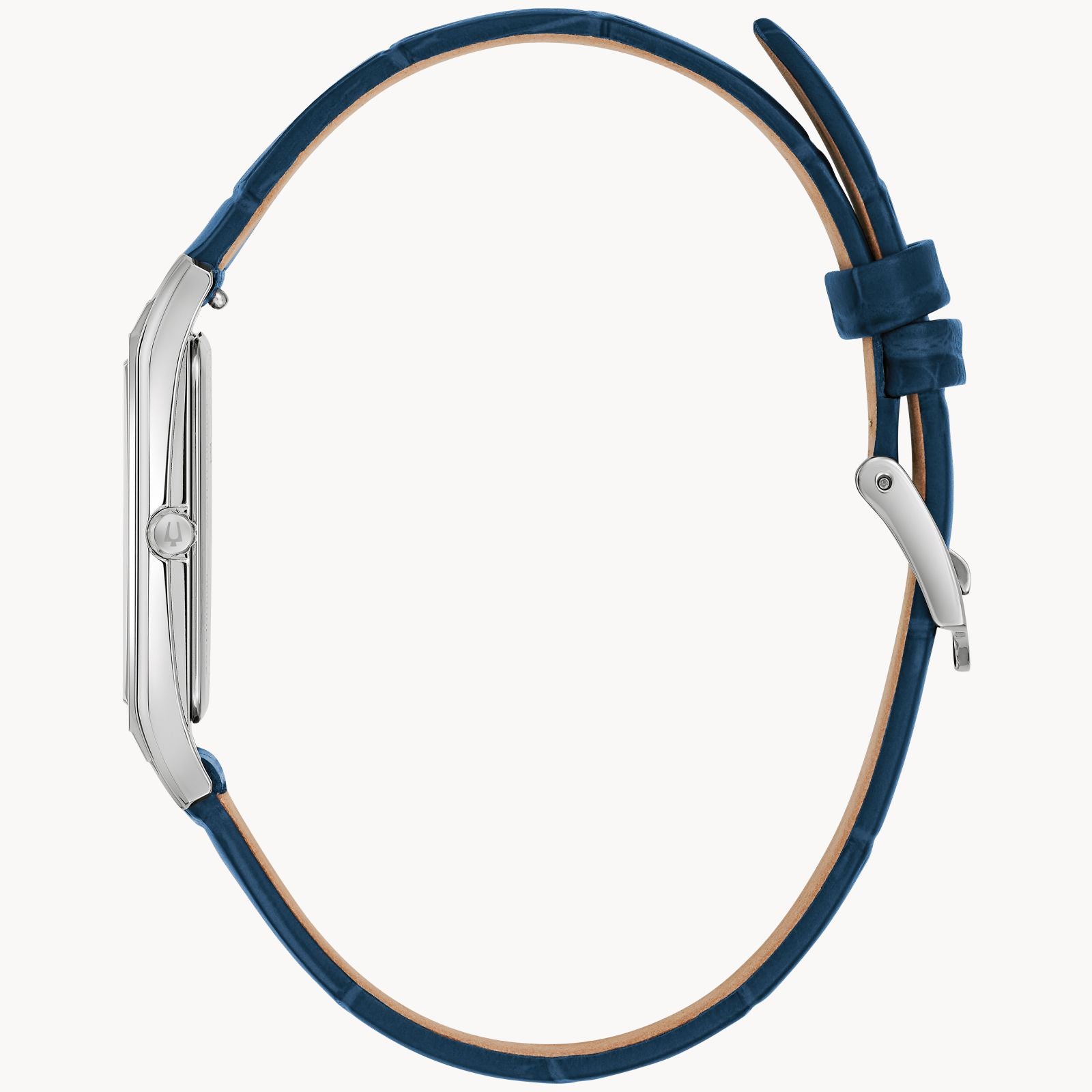 The rectangular men’s Sutton is the new paragon for classic elegance. Crafted with a sleek geometric design with brushed and polished finishing, the slim silver-tone stainless steel case is set with a sapphire crystal. It features thoughtfully incorporated angles and lines for an impactful presence on the wrist. The textured blue dial’s hobnail pattern is iconic, while the alternating silver-tone baton and Roman numeral markers convey a timeless quality. The dial is appointed with a 6 o’clock date display and polished silver-tone hands. The watch is carefully paired with a blue embossed leather strap fitted with a pin buckle closure. Elevate your style with the slim and stylish rectangular Bulova Sutton.