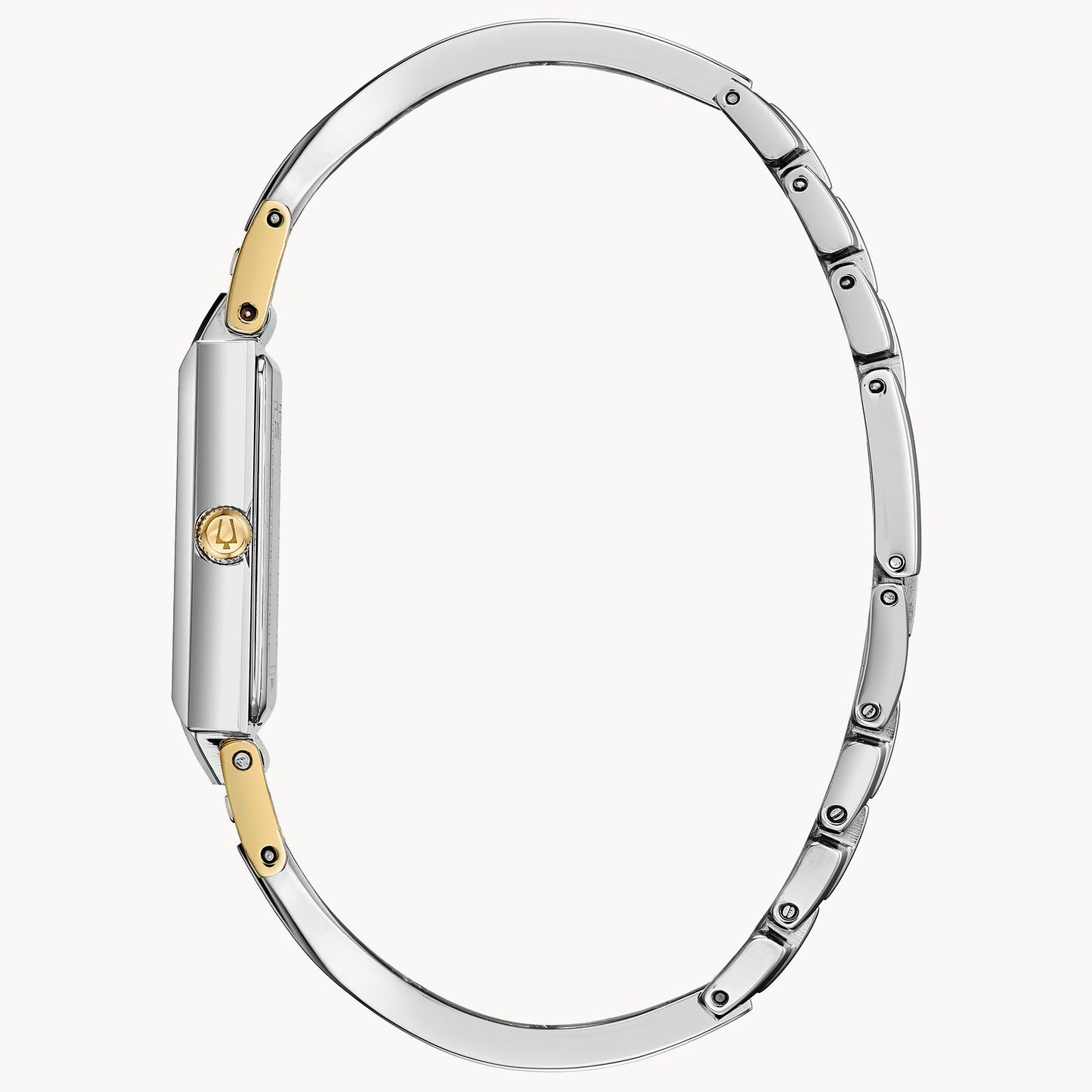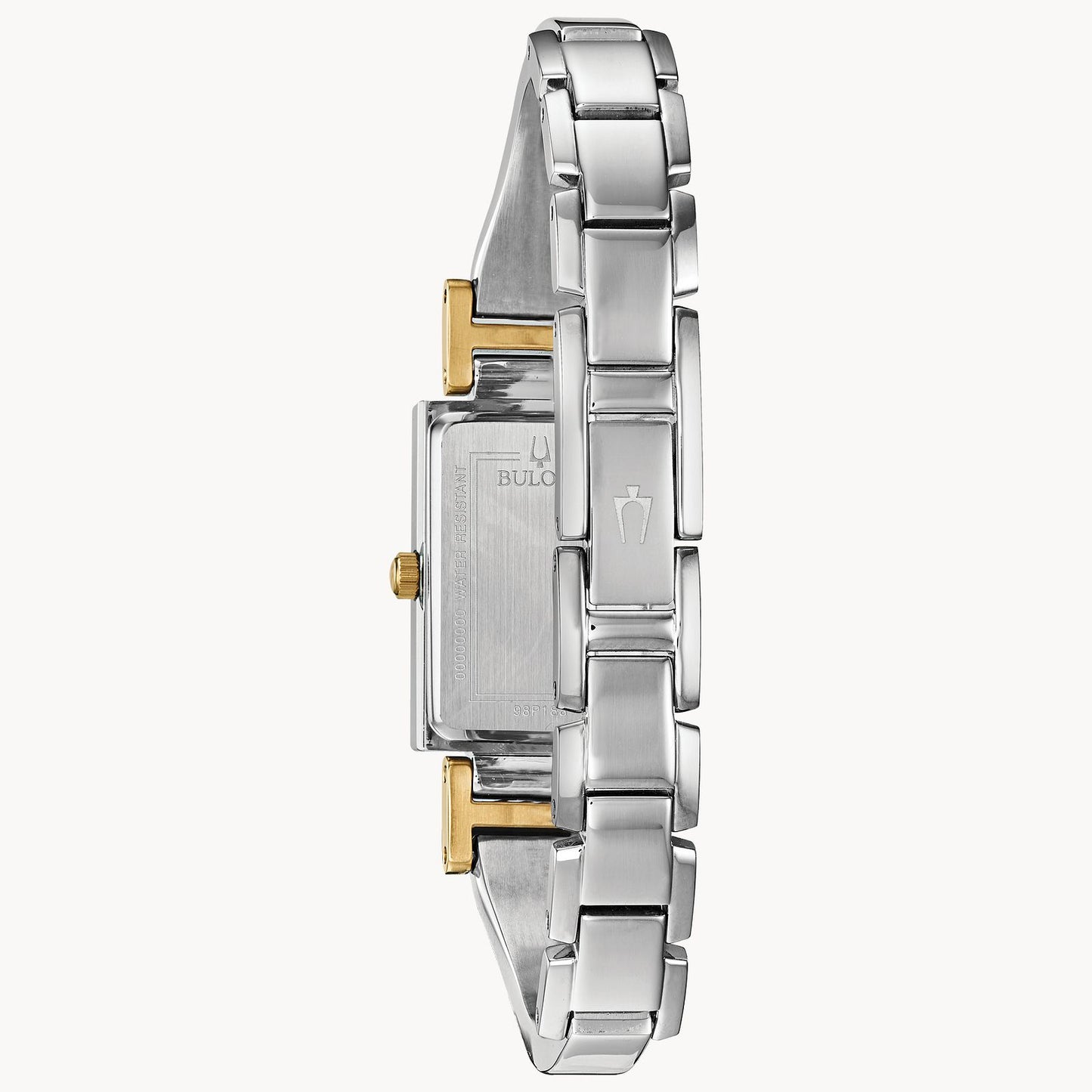 Silver tone stainless steel case with a gold tone crown. Stainless steel bracelet with silver and gold tone accents. White mother of pearl dial complete with three diamonds. Watch features a flat mineral crystal, quartz movement, and water resistance to 30 meters.
