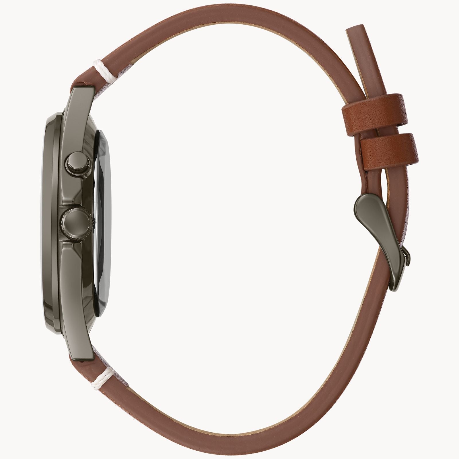 Clean, contemporary style. Gunmetal stainless steel case with an olive green dial has a backlit feature that illuminates the dial and is activated with a pusher at 2 o’clock. It also features a day/date window, luminous hands, and a contrast second hand. A brown leather strap with contrast stitching completes the look.