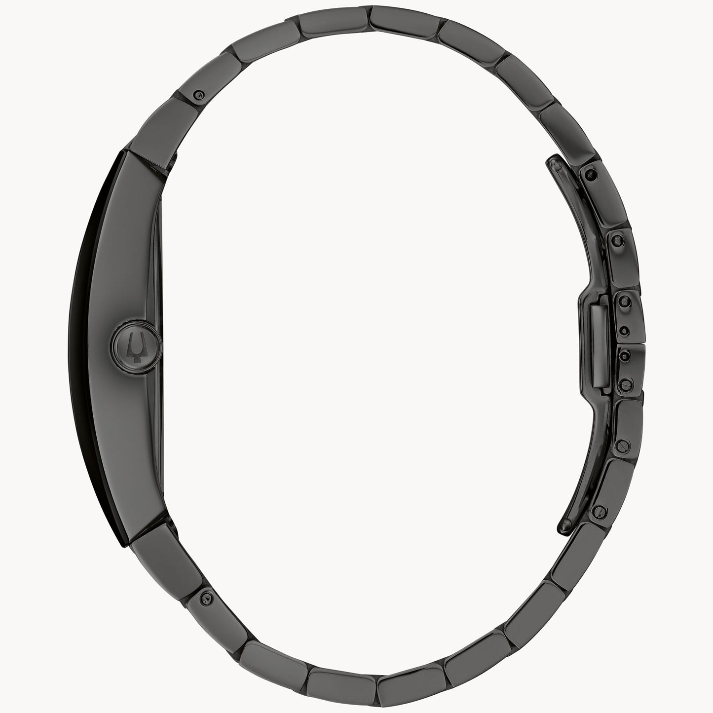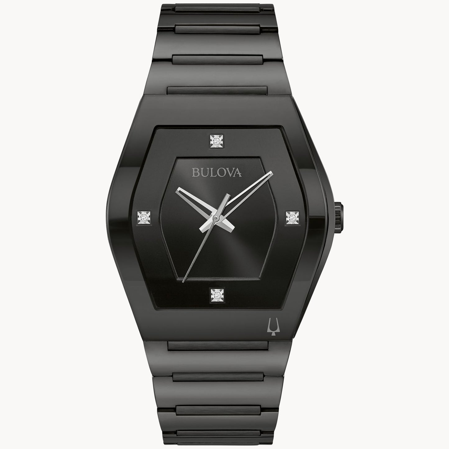 Meet the sleek new addition to the Bulova’s Modern Gemini watch collection, the Gemini Diamond. This watch has a refined, contemporary appeal with its black curved tonneau stainless steel case featuring signature Modern metalized edge to edge crystal. The black 3-hand dial, is accented by 4 brilliant hand-set diamonds at the 15-minute markers. The stainless steel black bracelet, with a deployant clasp and pushers, completes the streamlined, monochrome effect. This exceptional timepiece has a polished look that exemplifies the wearer’s sense of style.