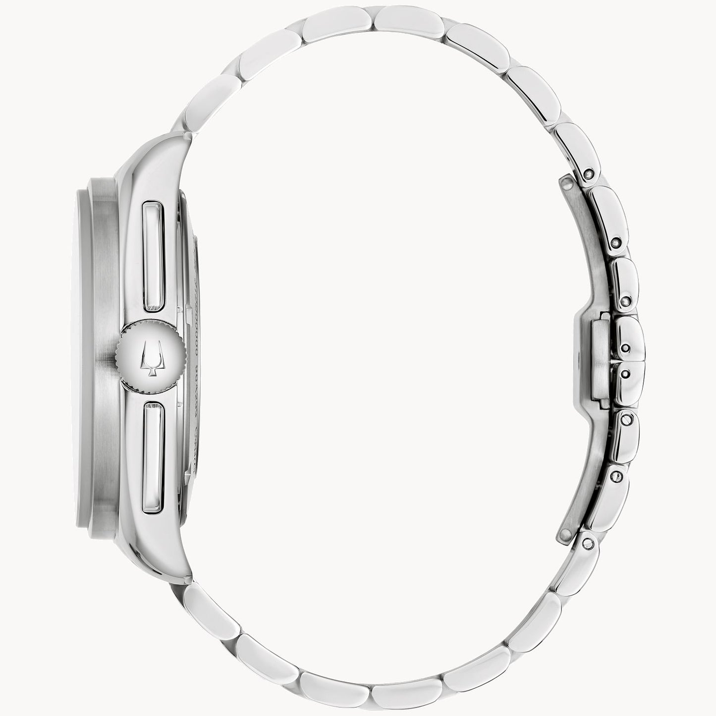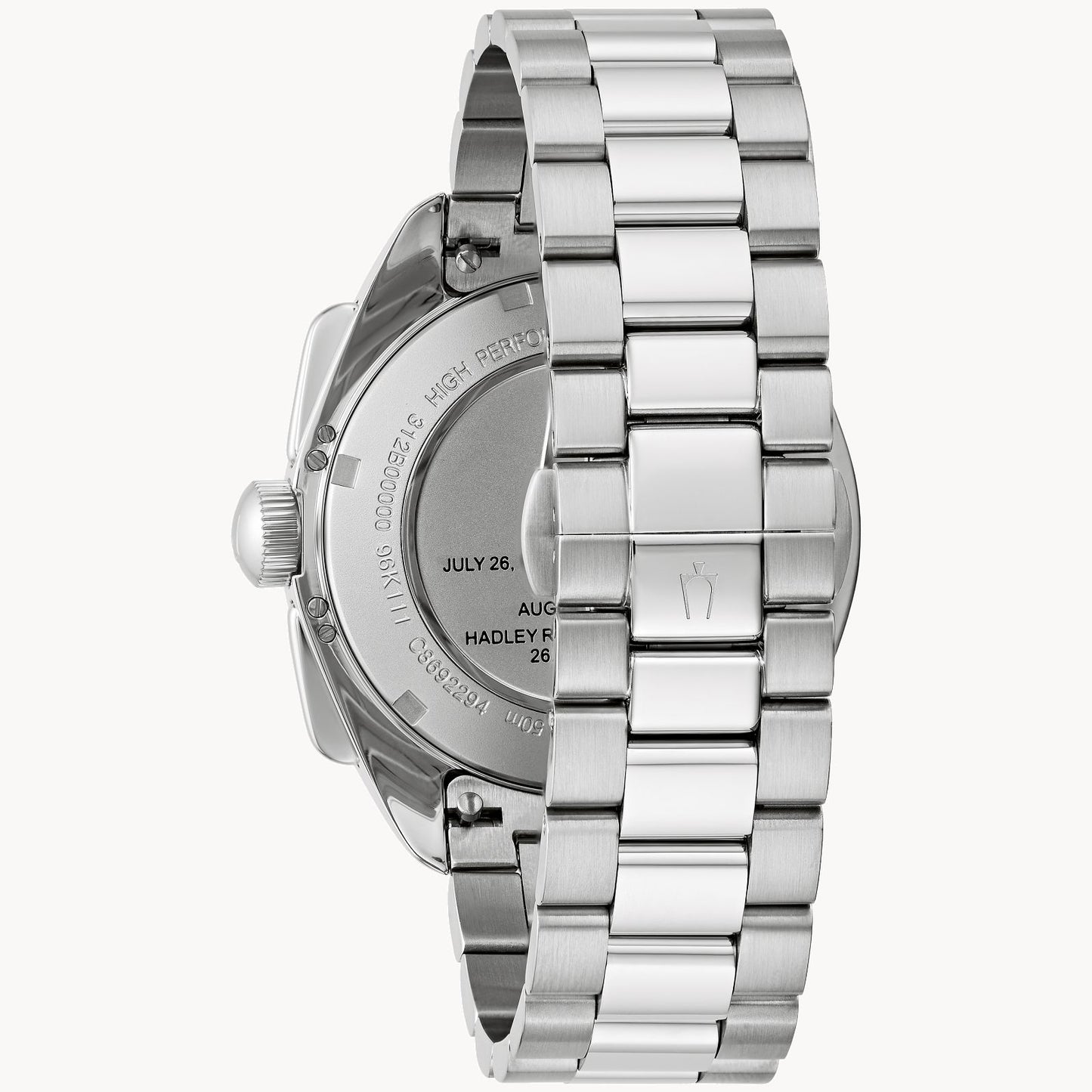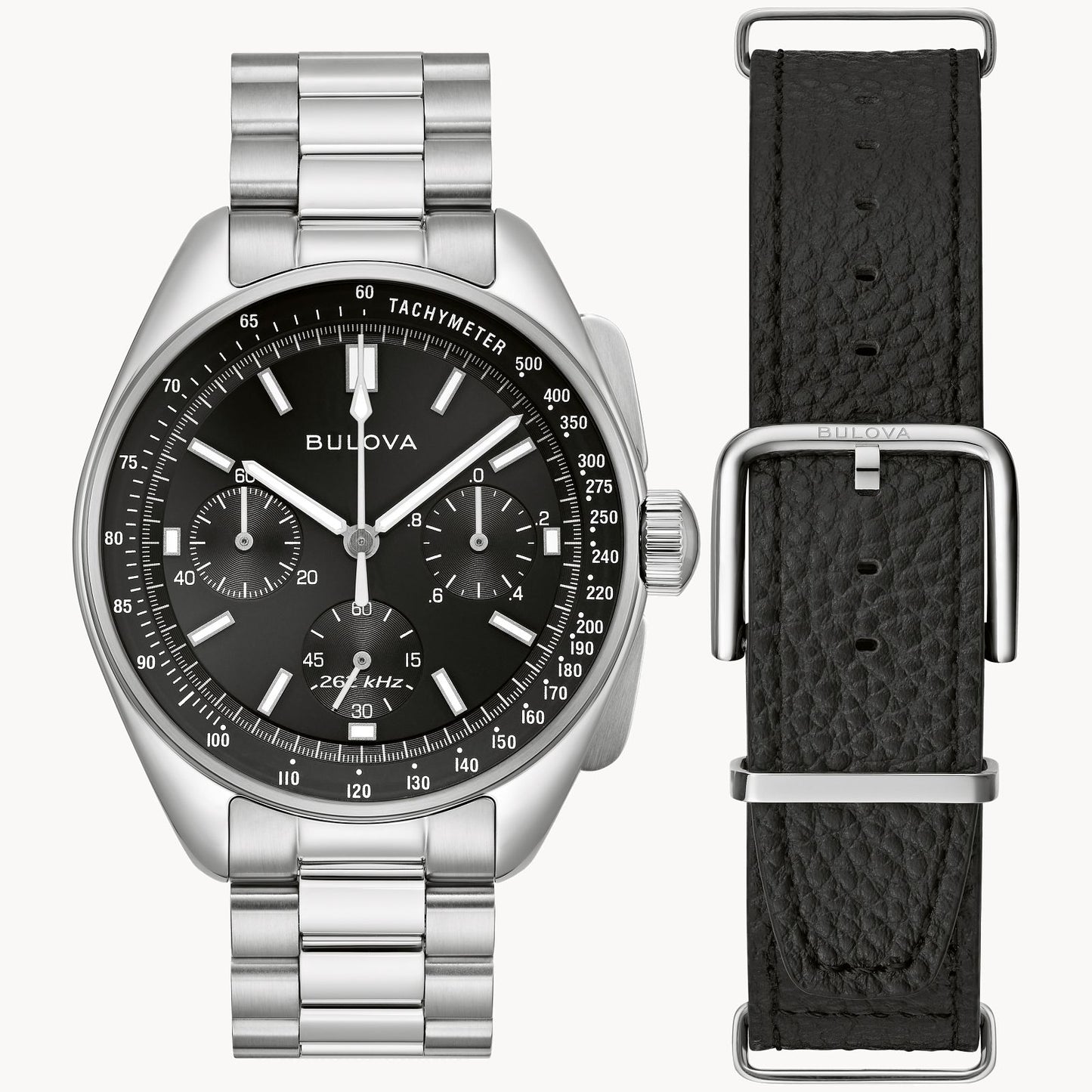 On August 2, 1971, a Bulova chronograph was worn on the moon, engineered for the demands of the lunar environment. Now, Bulova returns to the design and updates it with an exclusive high precision quartz movement, continuing its legacy of precision timing with the men’s Bulova Lunar Pilot chronograph from the Archive Series. The Lunar Pilot chronograph features the same 43.5mm silver-tone stainless steel case as the original Bulova chronograph. Slim chronograph pushers and a crown featuring the Bulova tuning fork logo are positioned at 3 o’clock. Under the flat sapphire crystal, the six-hand chronograph dial is rendered in a deep black evocative of space, with stark white accents including the tachymeter ring and retro Bulova logo. The slim hands and applied markers offer exceptional legibility and are applied with super luminova for low-light display. The recessed, circular grooved sub-dials include a 1/20 chronograph seconds counter at 3 o’clock, running seconds hand at 6 o’clock, and a 60-minute chronograph counter at 9 o’clock. The Lunar Pilot is powered by Bulova’s proprietary high precision quartz movement, resonating at a frequency of 262khz for unparalleled accuracy. The watch is paired with a matching 3-link silver-tone stainless steel bracelet with a push-button deployant clasp and a NATO leather strap, both of which feature an easy release system for quick changes. The Bulova Lunar Pilot brings the past to the present with a design from space exploration history, perfect for the modern adventurer.