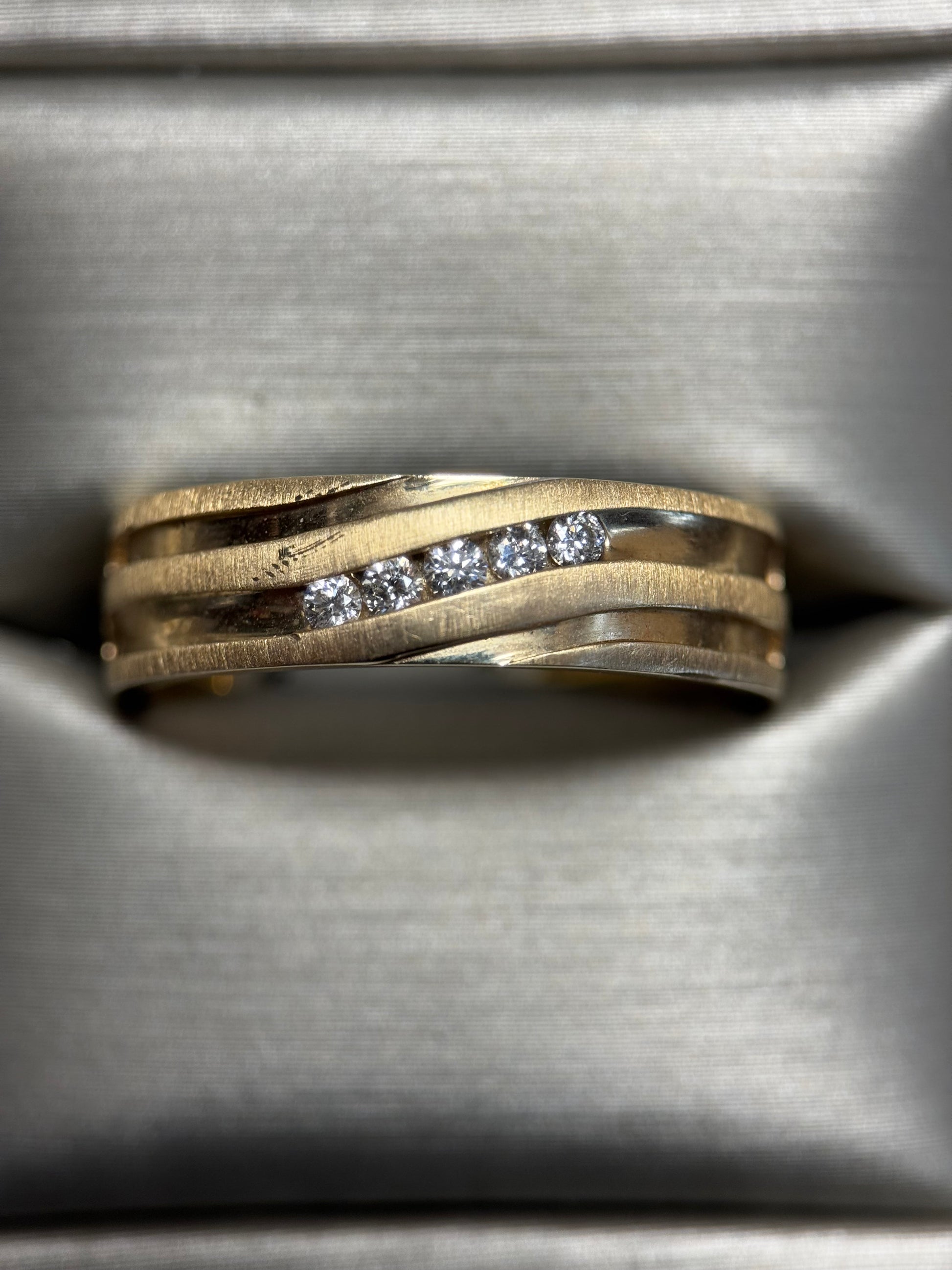 This vintage men's 14k yellow gold ring features a 10.25 size and a weight of 7.2g. The band is 6.3mm wide and showcases 0.17 carats of diamonds. It is stamped with a 14k mark. For any further inquiries, please feel free to contact us. Also, be sure to browse our other high-quality items for sale. Thank you for your interest.