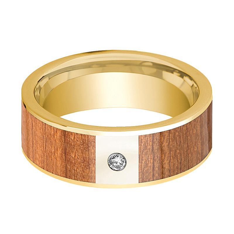 Mens Wedding Band 14k Yellow Gold Flat Wedding Ring with Sapele Wood Inlay Polished & Diamond - 8mm