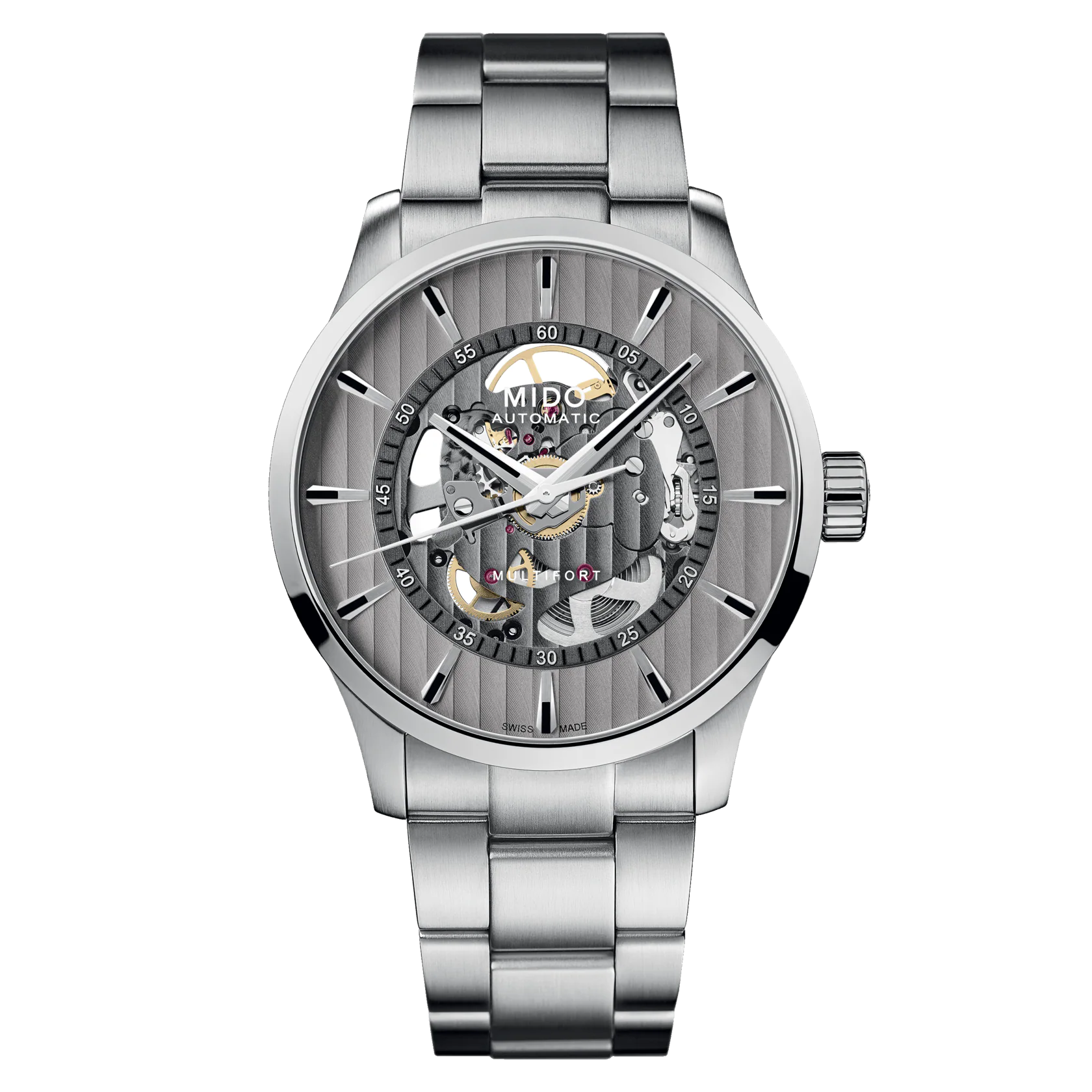 With its assertive aesthetics and visible mechanism, the Multifort Skeleton Vertigo Swiss Watch takes a bold stance. In a true stylistic and technological achievement, Mido showcases the heart of its automatic movement by revealing its finely skeletonised plate. The sporty timepiece shows a strong architectural influence – a characteristic of this collection inspired by the Sydney Harbour Bridge – with Geneva stripes adorning its unique face. Inside its robust steel exterior, the ultra-resistant Caliber 80, fitted with a Nivachron™ balance-spring, proudly displays its geartrain. Its exceptional autonomy lasts for up to 80 hours, promising ultimate accuracy for conquering the city without stopping.
