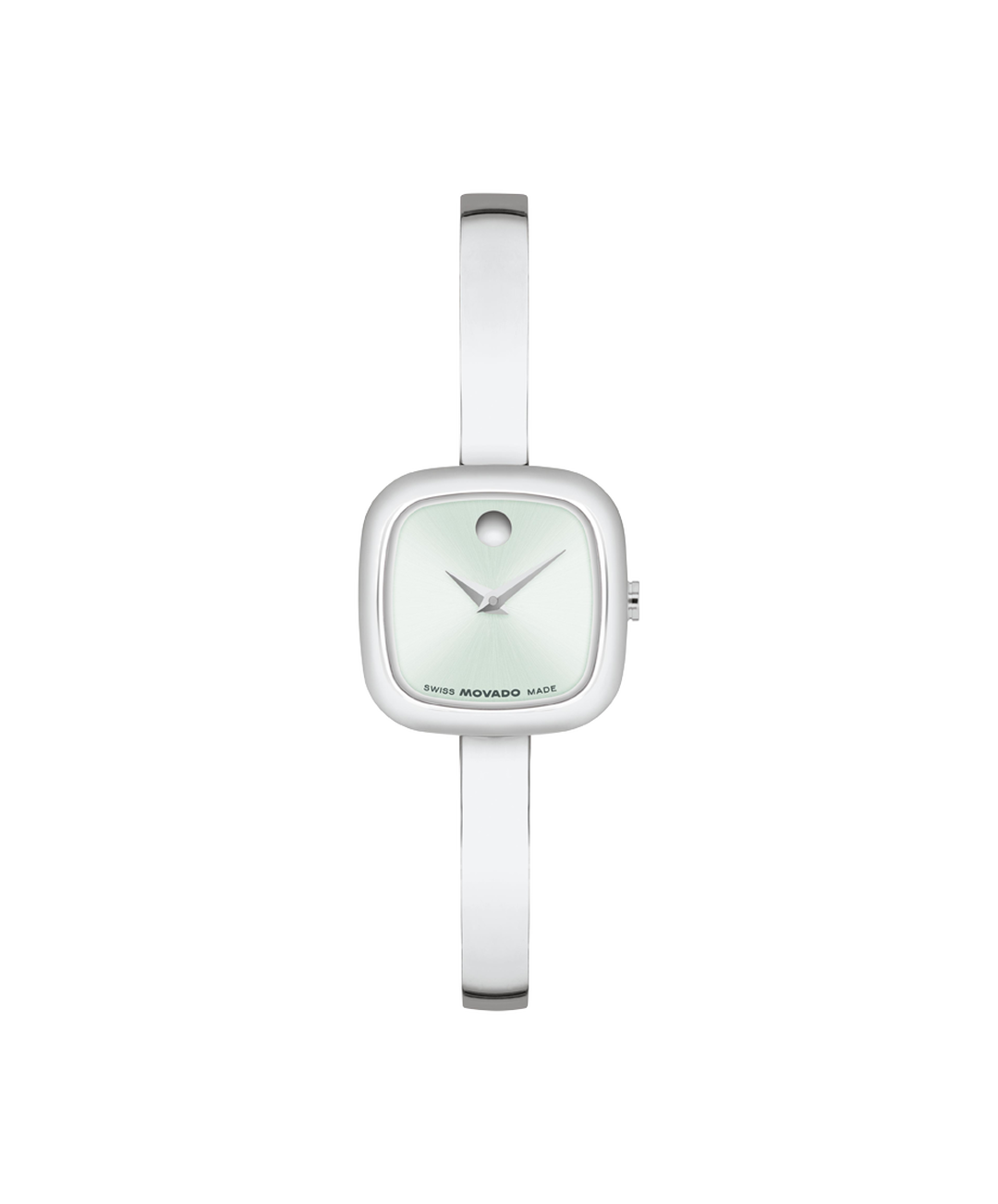 This 21.5mm watch features a cushion light sage green sunray dial, steel dauphine hands, and our signature dot at 12 o'clock.