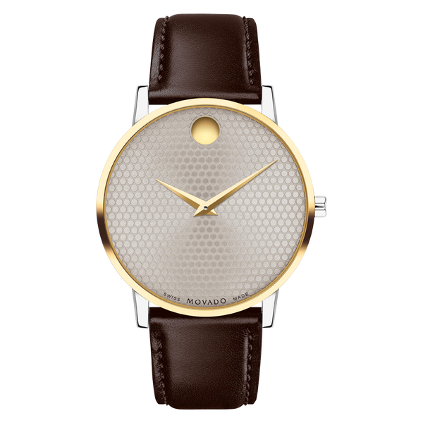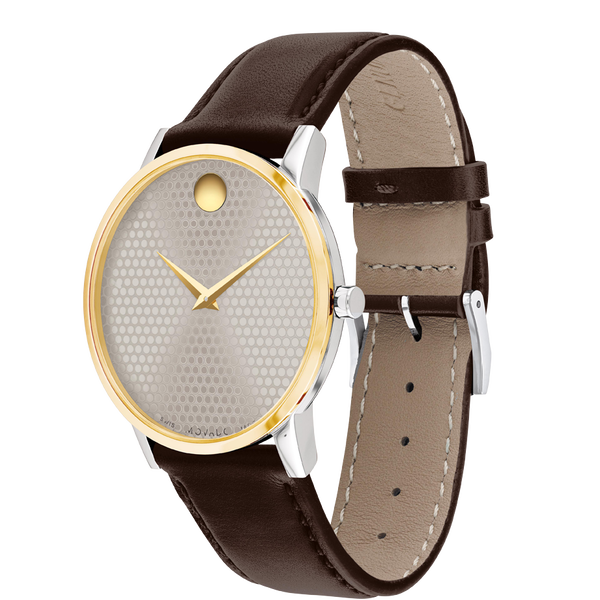 It’s time you owned a masterpiece. The Movado Museum Classic is an icon of modern design, featured in museums worldwide and renown for the elegant simplicity of the dial—defined by a single dot at 12 o’clock, a design element that symbolizes the sun at high noon. In this style, we’ve paired a 40mm case in two-tone silvertone & yellow goldtone PVD stainless steel with a warm grey dot-textured dial—outfitted with our signature dot and slender hands in matching golden hues—and a luxurious chocolate brown leather strap.
