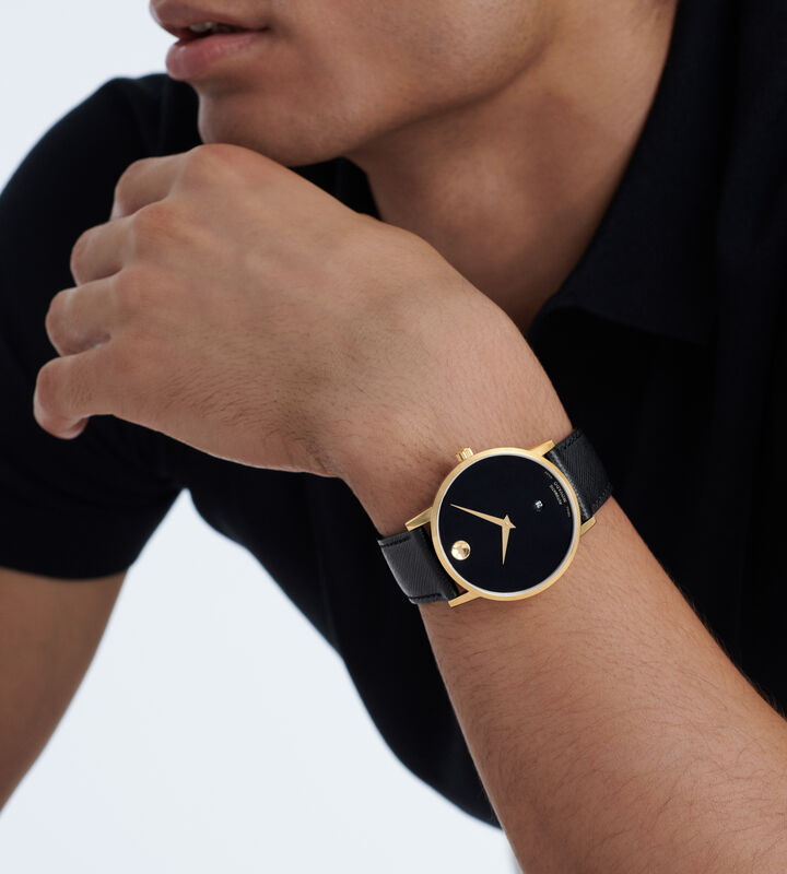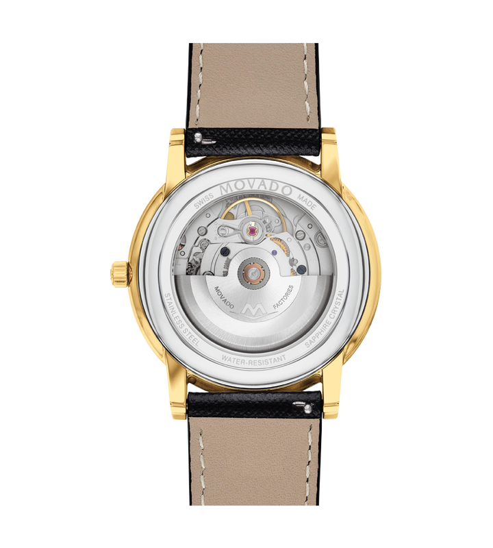 Movado Museum Classic Automatic, 40mm yellow gold PVD-finished stainless steel case with black dial on black saffiano leather strap. Caseback features an exposed automatic movement.