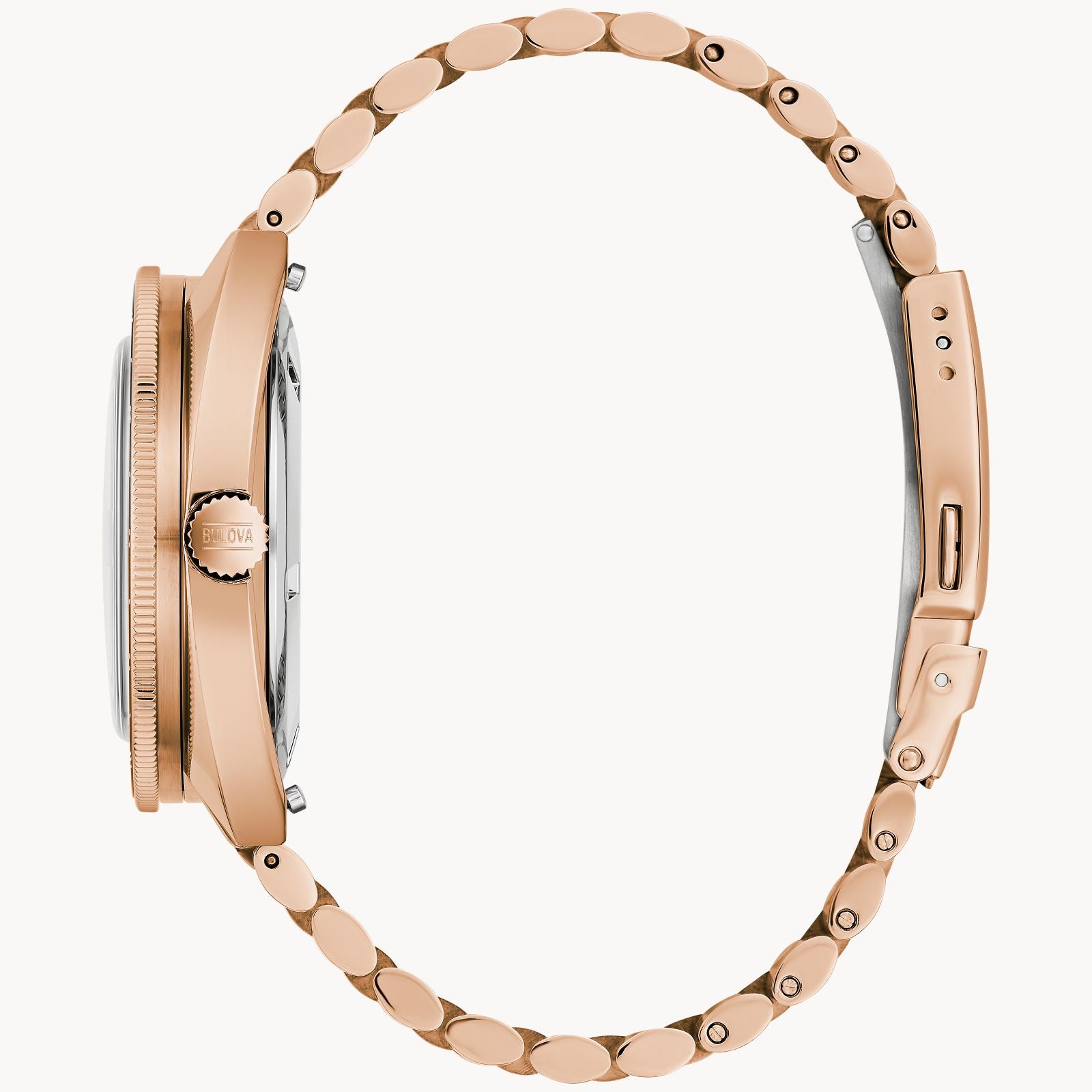 This new men’s Bulova Oceanographer GMT brings a new look and new functionality to the legendary Bulova design. The rose gold-tone stainless-steel case features a curved silhouette, a box sapphire crystal, a two-tone “root beer” bidirectional rotating 24-hour bezel, and a screw-down crown providing 200m of water resistance. A vivid black dial is accented by tasteful pops of rose gold color, with applied luminescent hour markers, bold hands including a 24-hour hand and featuring luminescent paint, and a date display. An independently adjusted hour hand allows for easy setting of the local time. The Oceanographer GMT is powered by a self-winding GMT movement with 24-jewels and a power reserve of 42 hours, protected by a screw-down caseback. Paired with a matching three-link bracelet with a sport foldover clasp. Wherever you go, whatever you do, the men’s Bulova Oceanographer GMT will make sure you do it in style.