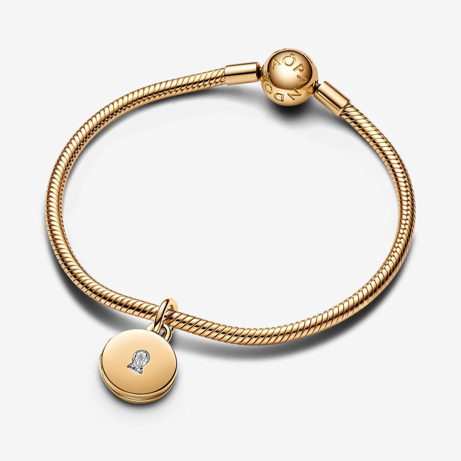 Keep what's most dear to you close to your heart with the Openable & Engravable Love Locket Dangle Charm. This 14k gold-plated locket charm features a clear cubic zirconia stone on the front in the shape of a keyhole, and opens and closes securely so you can keep a tiny picture, note or lock of hair inside. The inside of the locket is engraved with the message "TODAY TOMORROW ALWAYS", and the back is blank for your own engraving. Wear it on your Pandora Moments necklace or bracelet as a symbol of keeping your love safe and a reminder to cherish it, every day.