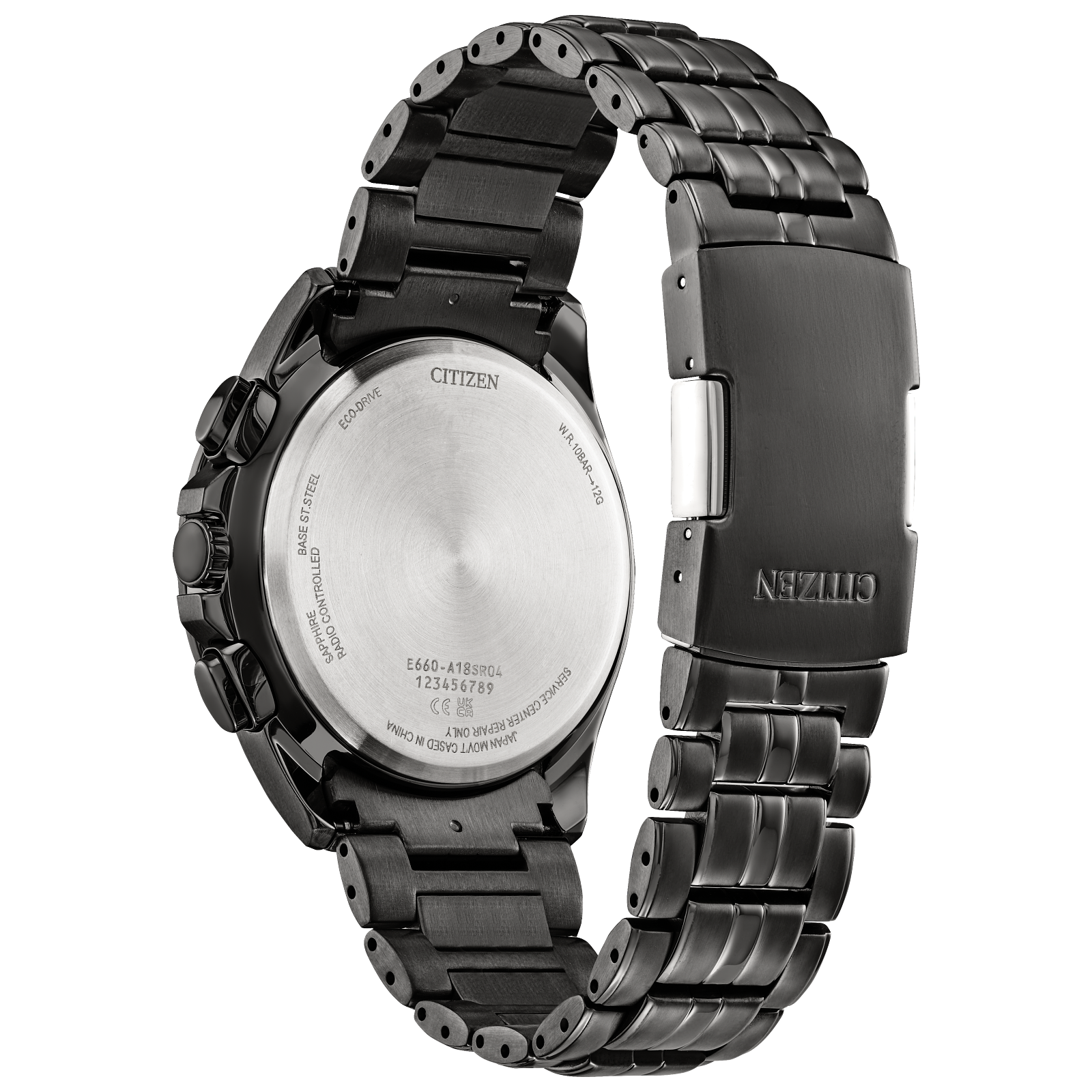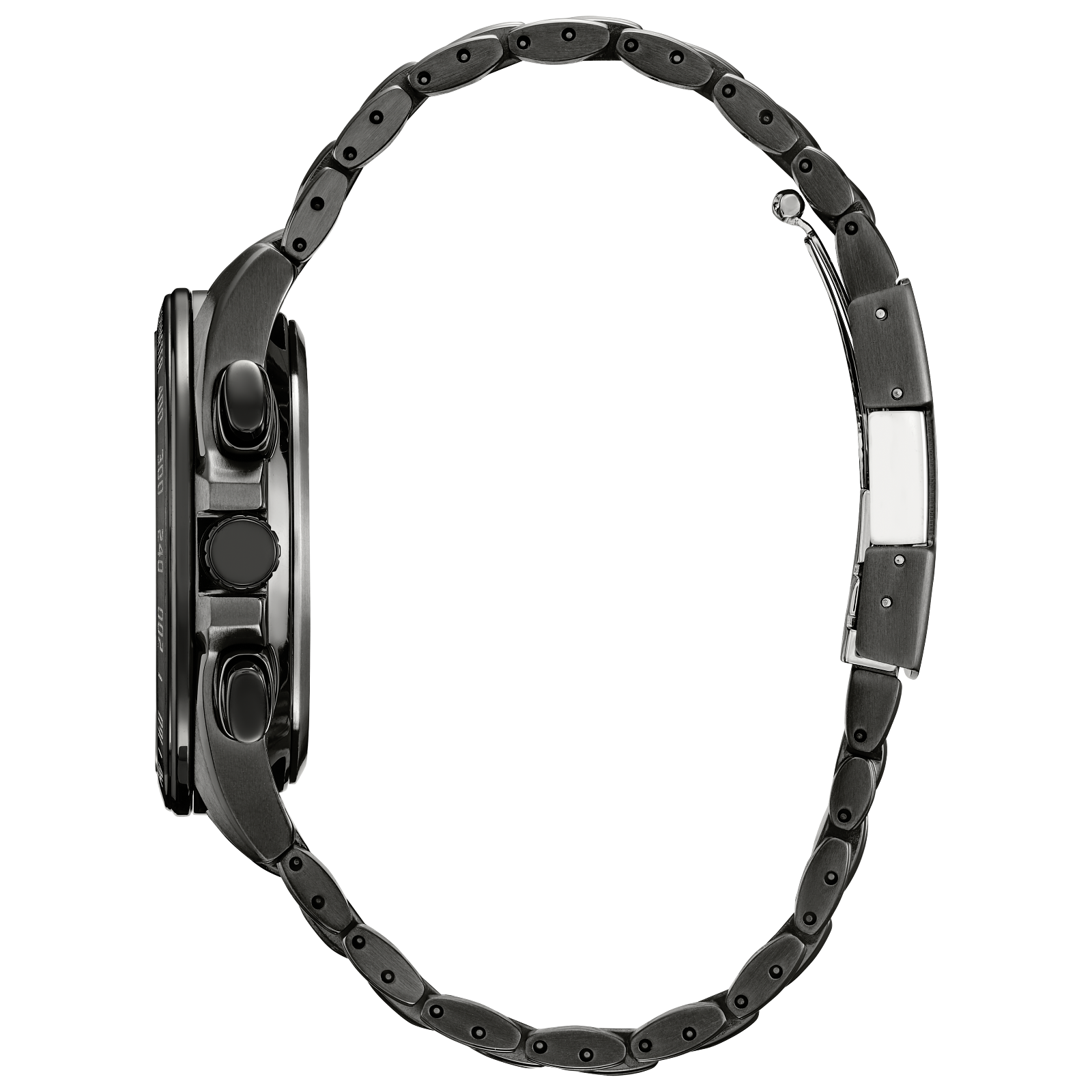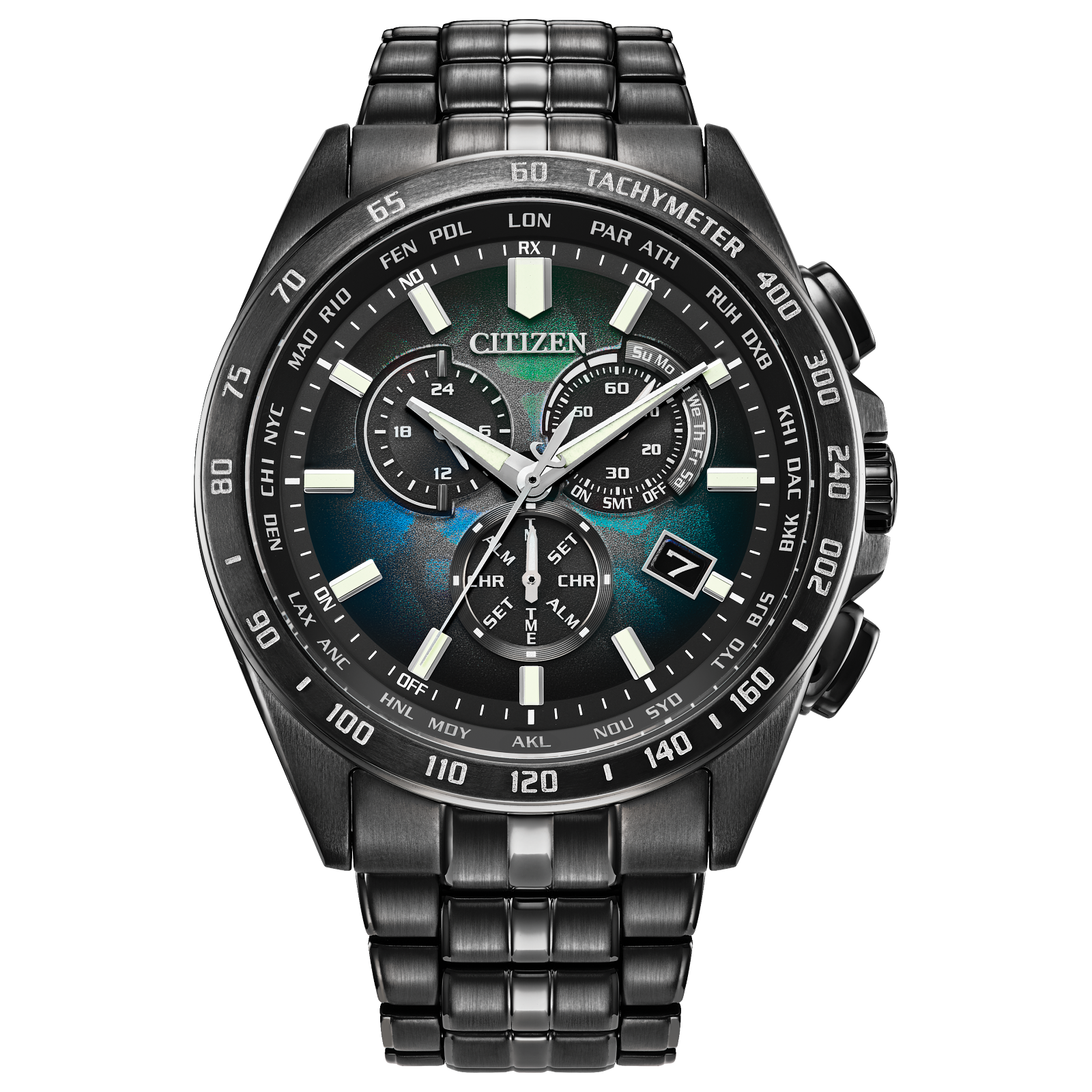 Joining Citizen's cutting-edge catalog of timekeepers, the sharp chronograph features a gray IP stainless steel case, measuring 43mm in diameter. Secured to the wrist via a matching 5-link bracelet, this striking timepiece also features an outer tachymeter and inner world time-equipped bezels that hint at the elevated technological capabilities of the watch, while a duo of stepped chronograph pushers and crown guards provide a sleek and sporty touch. On the Earth-inspired dial, a three-register chronograph is at work, with touches of greens, purples, and blues adding crystalline-like dimensionality alongside the utility of a day and date display.