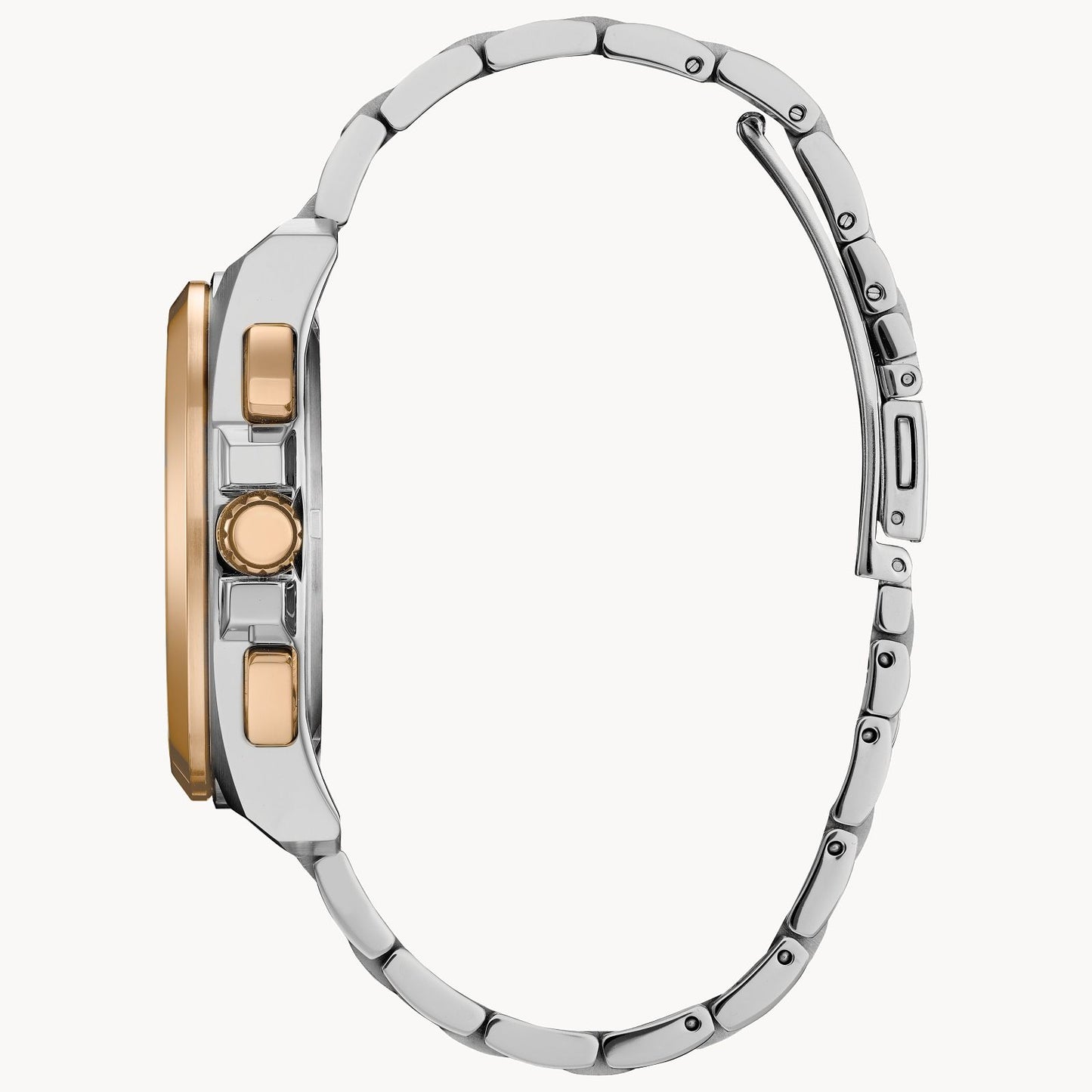 Make a distinctive style statement with the new Citizen men’s dress watch from the Classic collection. The two-tone stainless steel case holds the silver-tone dial with a 1/5 second chronograph that measures up to...60 minutes, 12/24-hour, time and date. The sleek dial is finished with a sapphire crystal. The two-tone stainless steel bracelet band has a fold over clasp with push buttons, giving the timepiece an understated refinement. This Eco-Drive watch is powered by any light source, eliminating the need for batteries, and is water resistant up to 100 meters. This professional-looking timepiece provides the wearer with lasting style and top performance.