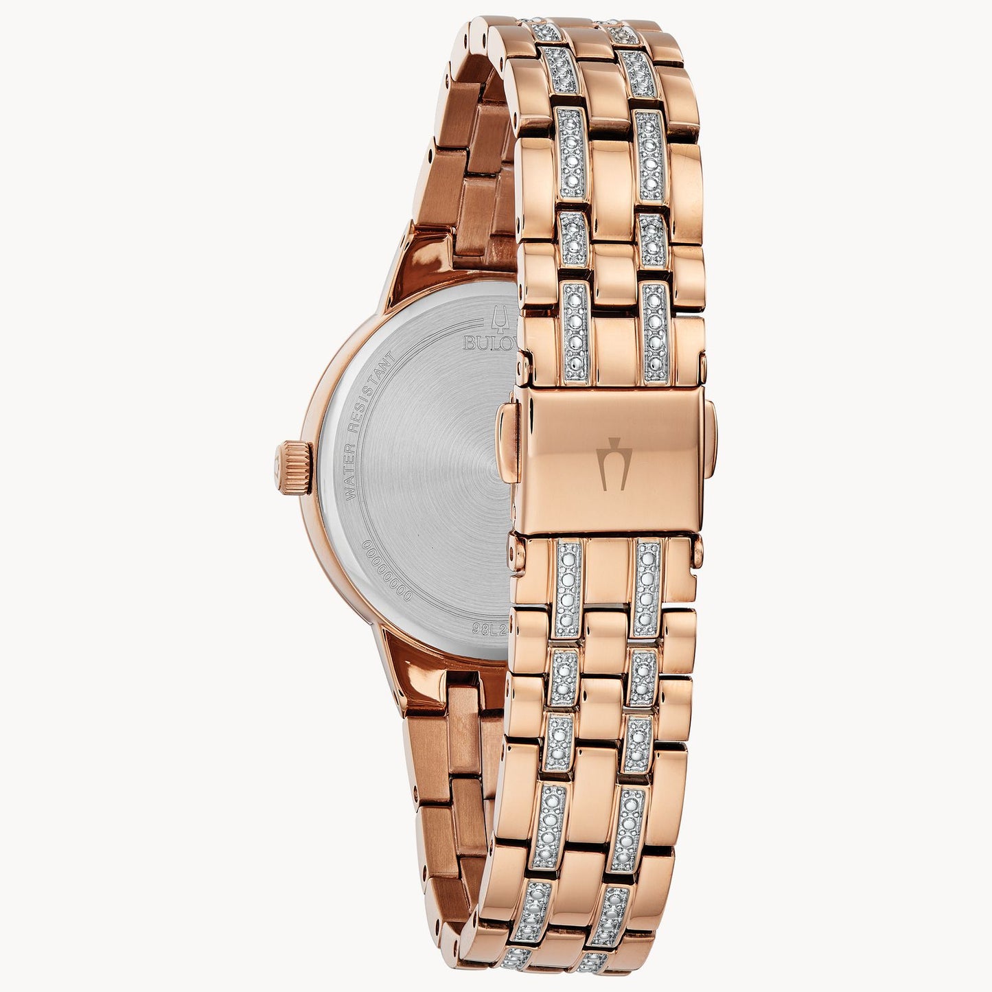 Rose gold-tone stainless steel case with rose gold-tone faceted mineral glass dial to convey a 3-D look. Embellished with 120 crystals on the rose gold-tone stainless steel case and bracelet with a short fold over buckle with pushers, flat mineral crystal, water resistance to 30 meters.