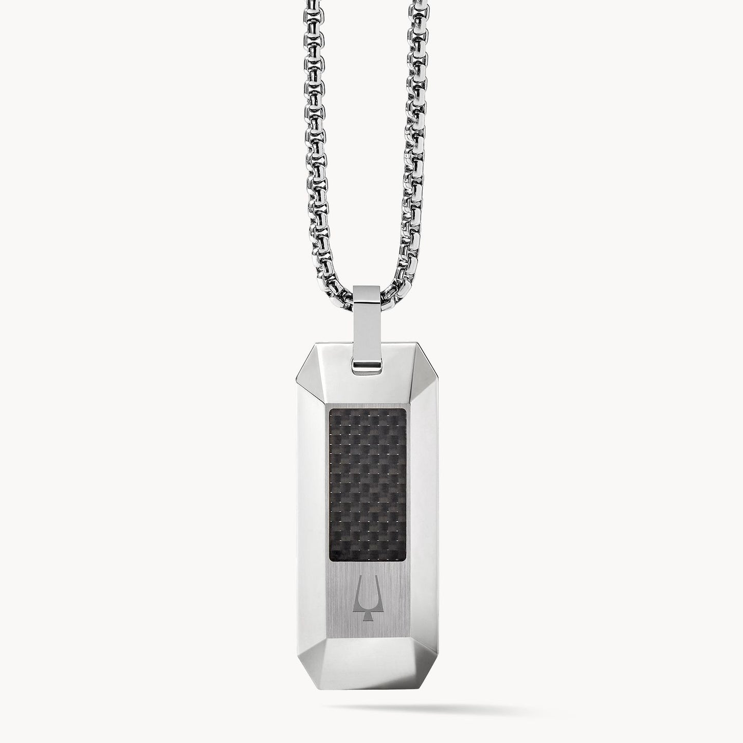 Contemporary boldly faceted stainless steel dog tag pendant with square black carbon fiber inlay, offers a statement look and signature details. Round box link chain with extender ring and signature tuning fork closure adjusts from 26” to 28”. Pendant measures 1.6 x .6 x 0.2 in.