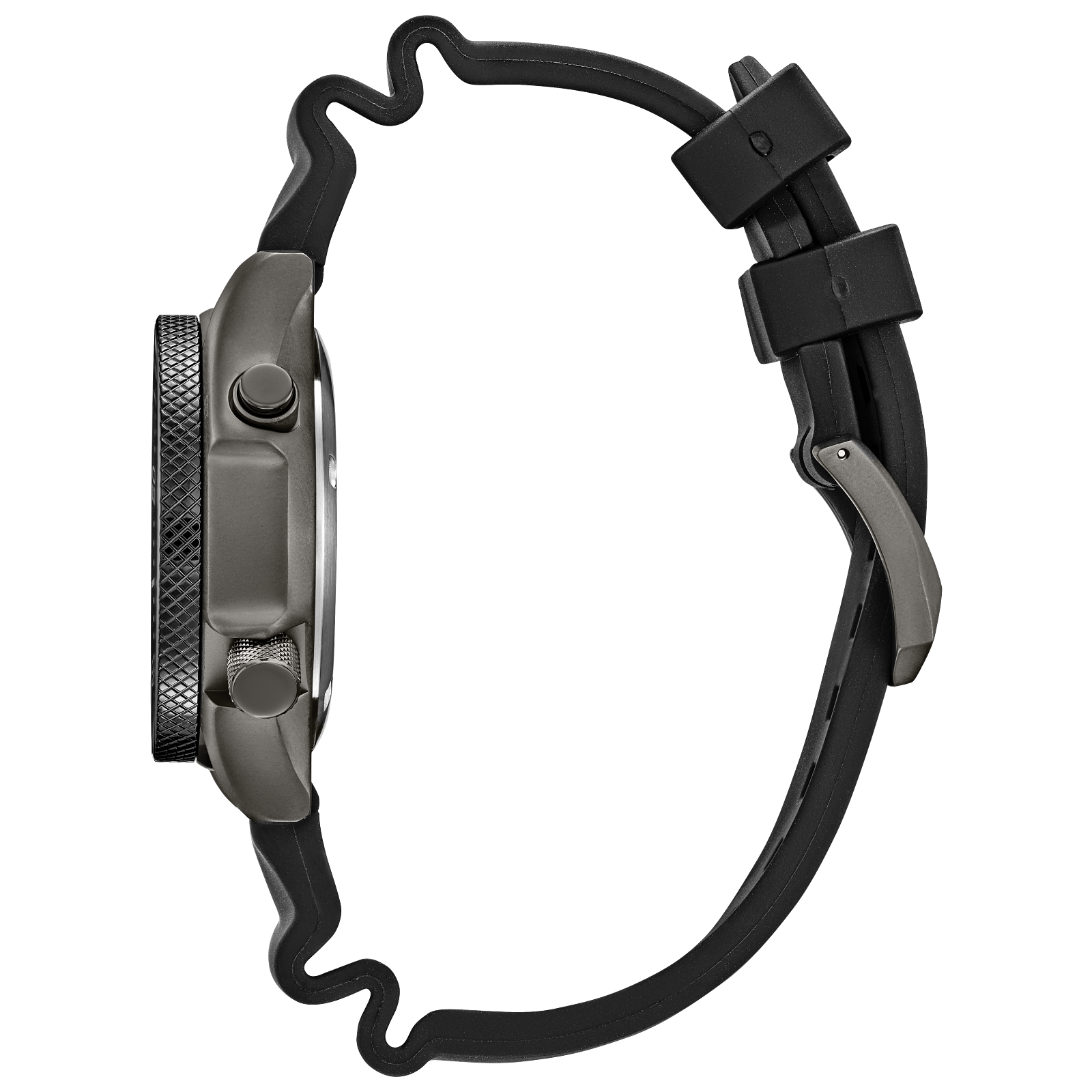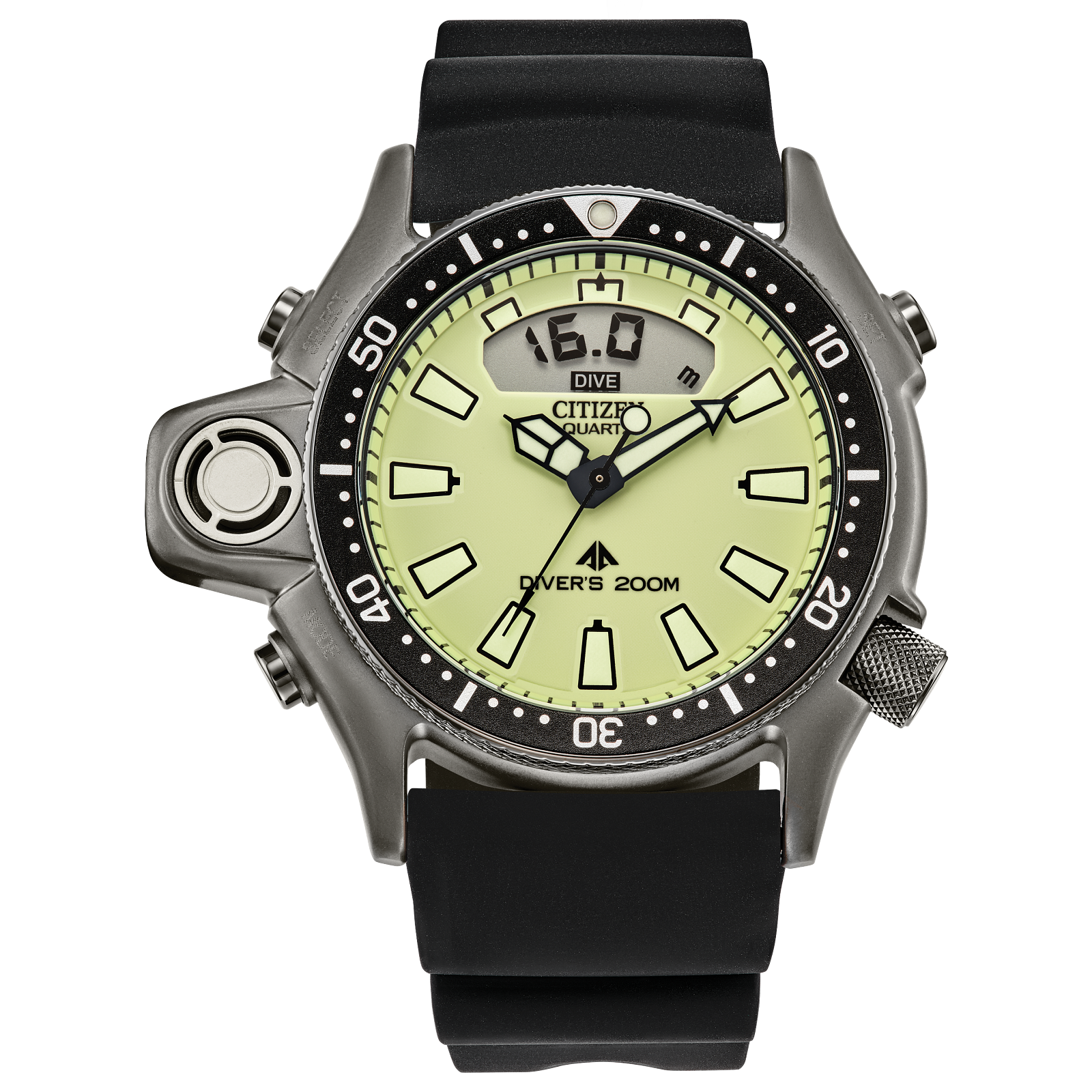 Ready, Set, Dive. An iconic name with a reinvented hybrid construction, the new retro-inspired Citizen Promaster Aqualand Quartz is an ISO-compliant watch that's ready for your next underwater adventure. Equipped with a maximum depth memory, rapid ascent alarm, and auto start dive mode, you won't want anything else on the wrist when heading out to the ocean. A robust, gray-tone stainless steel case with a screw-down crown compliments the ocean black polyurethane strap and high legibility luminous green three-hand dial. Water resistant up to 200 meters. Powered by the quartz-driven Caliber C520.