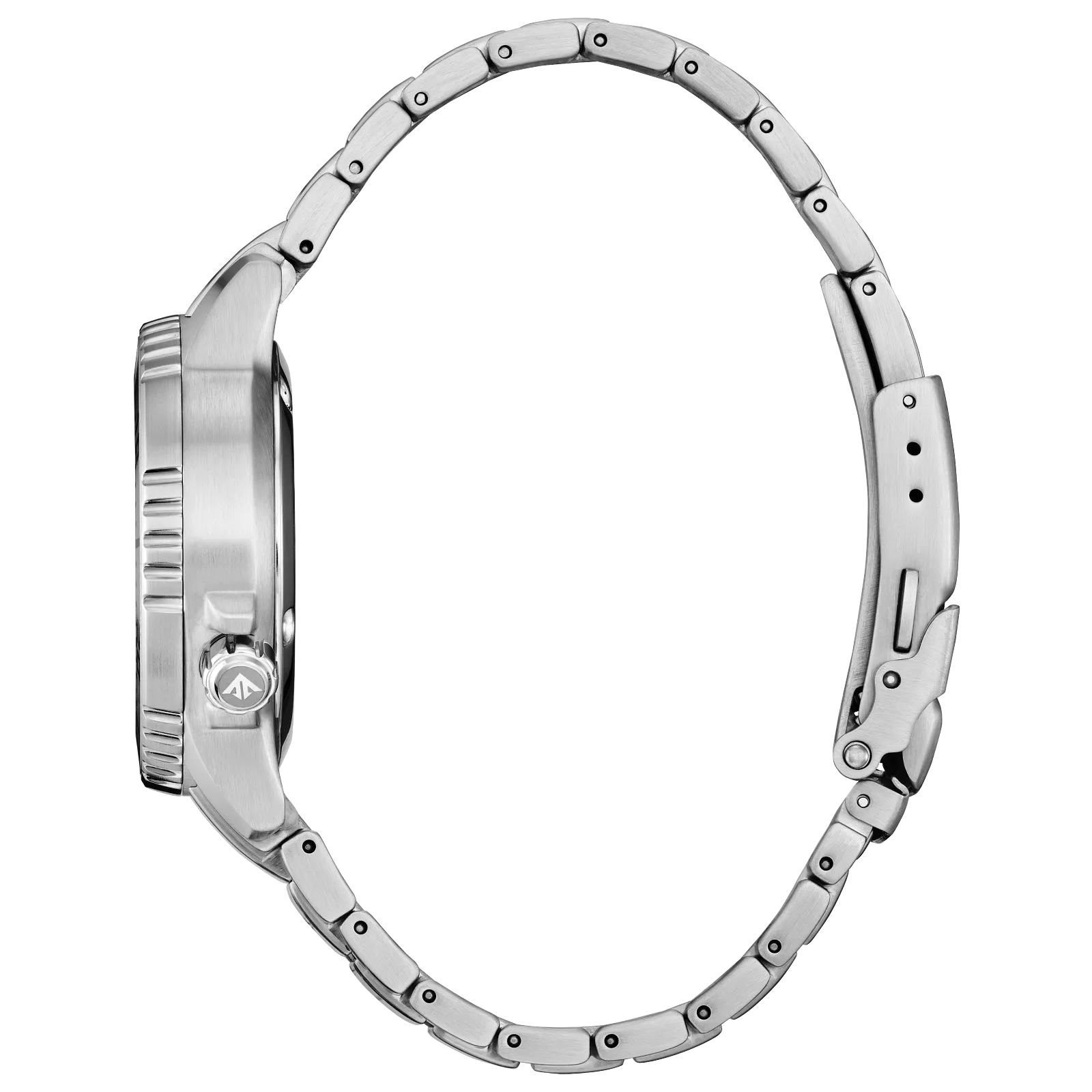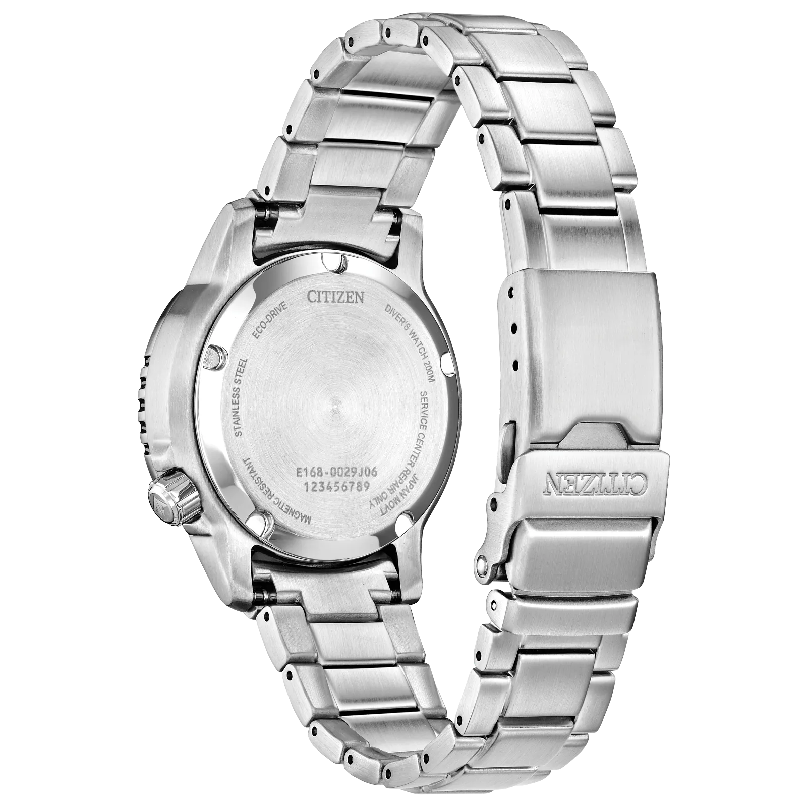 Submerge yourself in the latest Dive watch to join Citizen’s innovative Promaster line. The durable 37mm silver-tone stainless steel exterior comfortably fits wrists of all sizes, featuring an easy-grip uni-directional dive bezel and distinct crown at 4 o’clock. The monochromatic design is secured to the wrist via a case-matching silver-tone stainless steel bracelet.