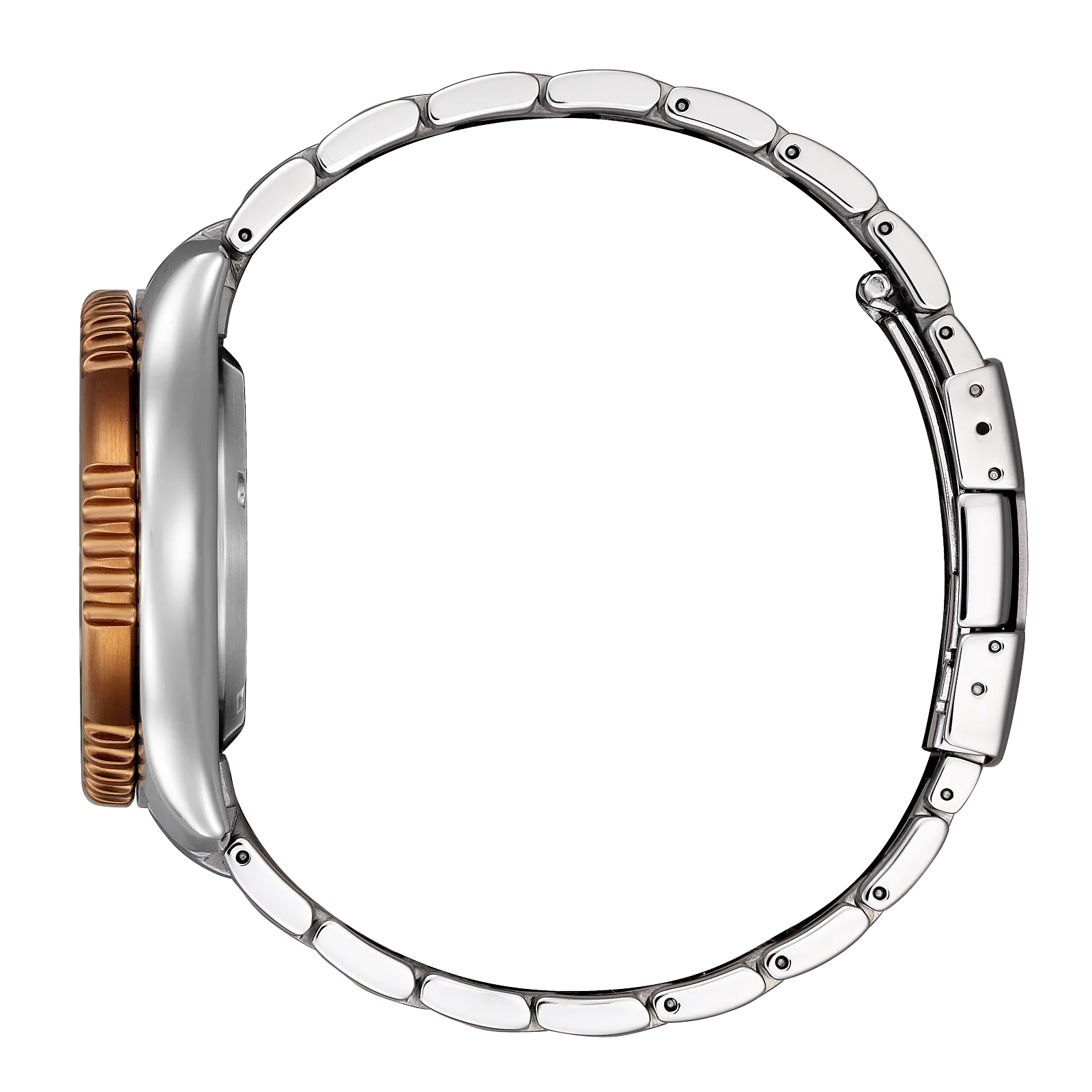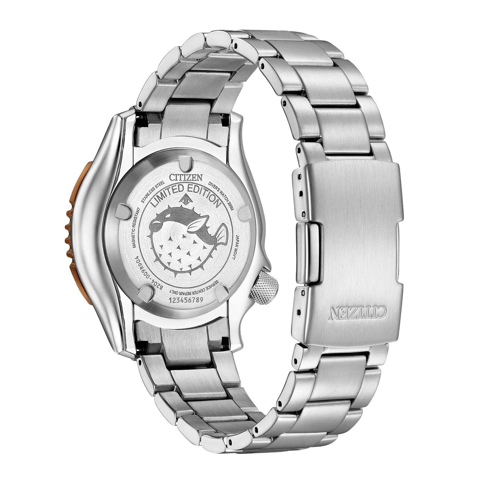 The past becomes the present with the new Promaster Dive Automatic men’s watch by Citizen. Going deeper into the history of the original version of this diving watch, it was released in 1989 for the new generation of dive watch enthusiasts. A design element that stands out is the distinctive, serrated bezel design that was inspired by fugu, the Japanese name for pufferfish. Featuring a 3-piece, 42mm case, sapphire crystal, and a black polyurethane strap, the brown rotating bezel with a black easy-grip aluminum ring surrounds the brown dial and luminous hands and markers. In contrast, the case back features an engraving of fugu or pufferfish. This technically advanced and automatic sport watch comes in an exclusive collector’s dive tank box with an interchangeable black rubber strap. It is ISO compliant with a screw-down crown and water resistant to 200 meters—caliber 8204.