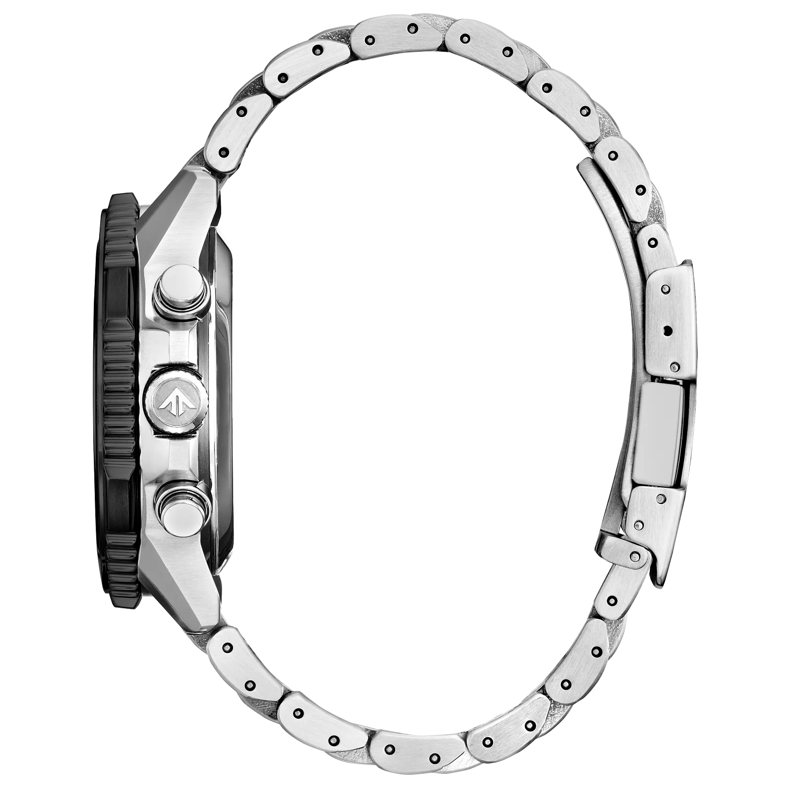 With advanced technology paired with an incredibly bold look, the latest Promaster Air Navihawk reaches a higher altitude in style. The watch's silver-tone stainless steel case measures 40mm in diameter and wears boldly with its sharp faceting and satin finishing. A slide-rule scale on the dark gray bezel provides additional flight utility. A triple-link stainless steel bracelet secures the timepiece to the wrist.