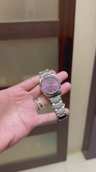 Rolex is on display with this incredible Oyster Perpetual. Named after two of Rolex's most infamous creations, this reference 116000 comes equipped with a sturdy 36mm stainless steel Oyster case with a screw down case back and Twinlock winding down crown to provide the ultimate in waterproof protection. Within the case lies a Perpetual 3130 Swiss certified movement that winds itself thanks to the movement of the wearer's wrist. Both of these impressive features played a major role in making the Rolex the world's most highly regarded watch brand. This reference 116000 also comes equipped with top-of-the-line features such as a scratch-resistant sapphire crystal, a 904L stainless steel flat link Oyster bracelet with a folding Oysterclasp, and a striking purple dial topped with luminous hour markers and hands.