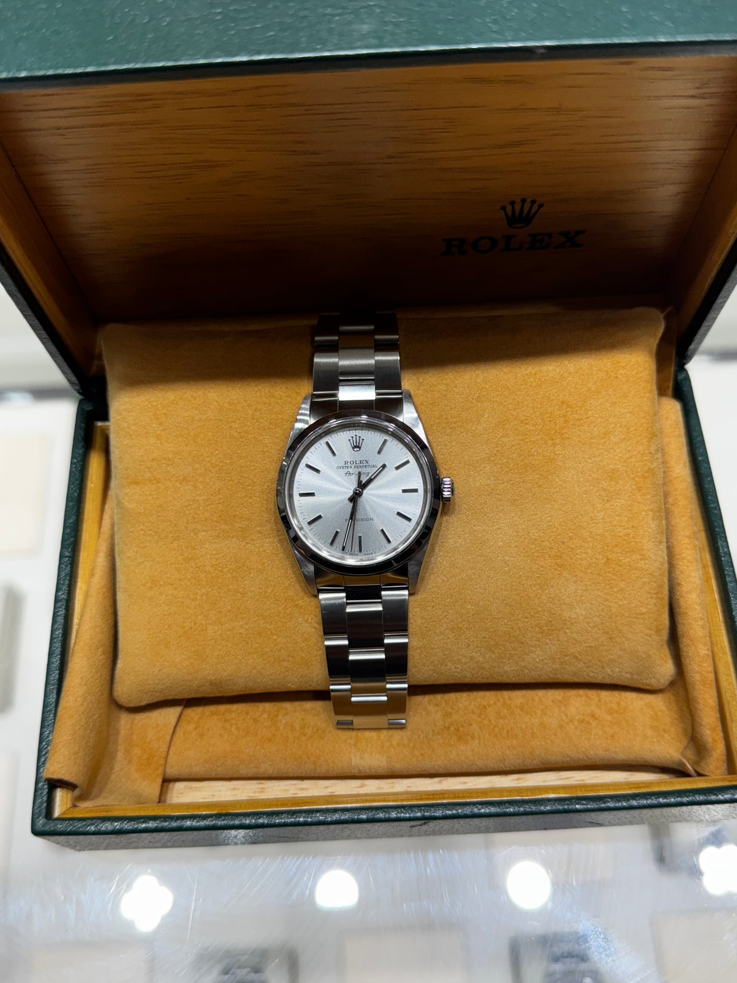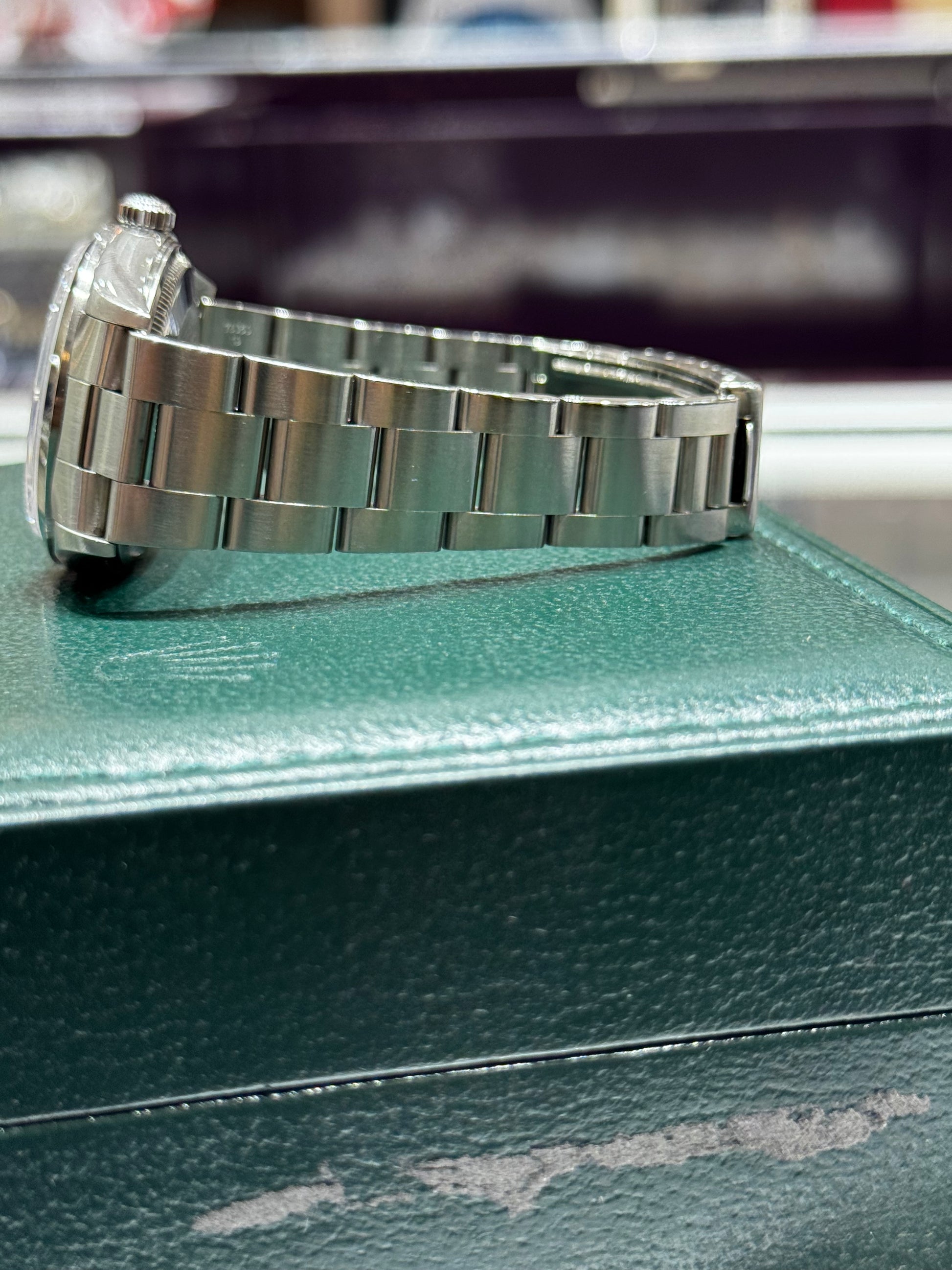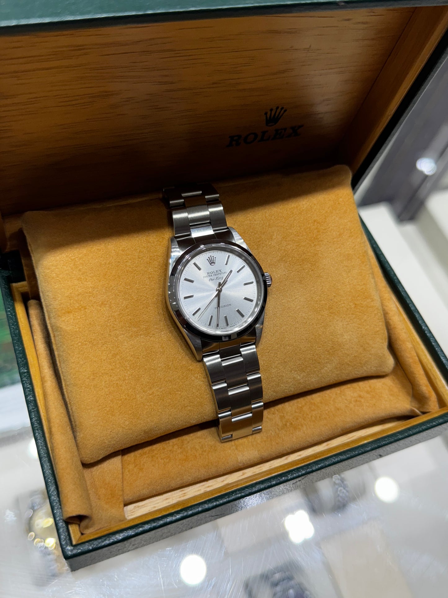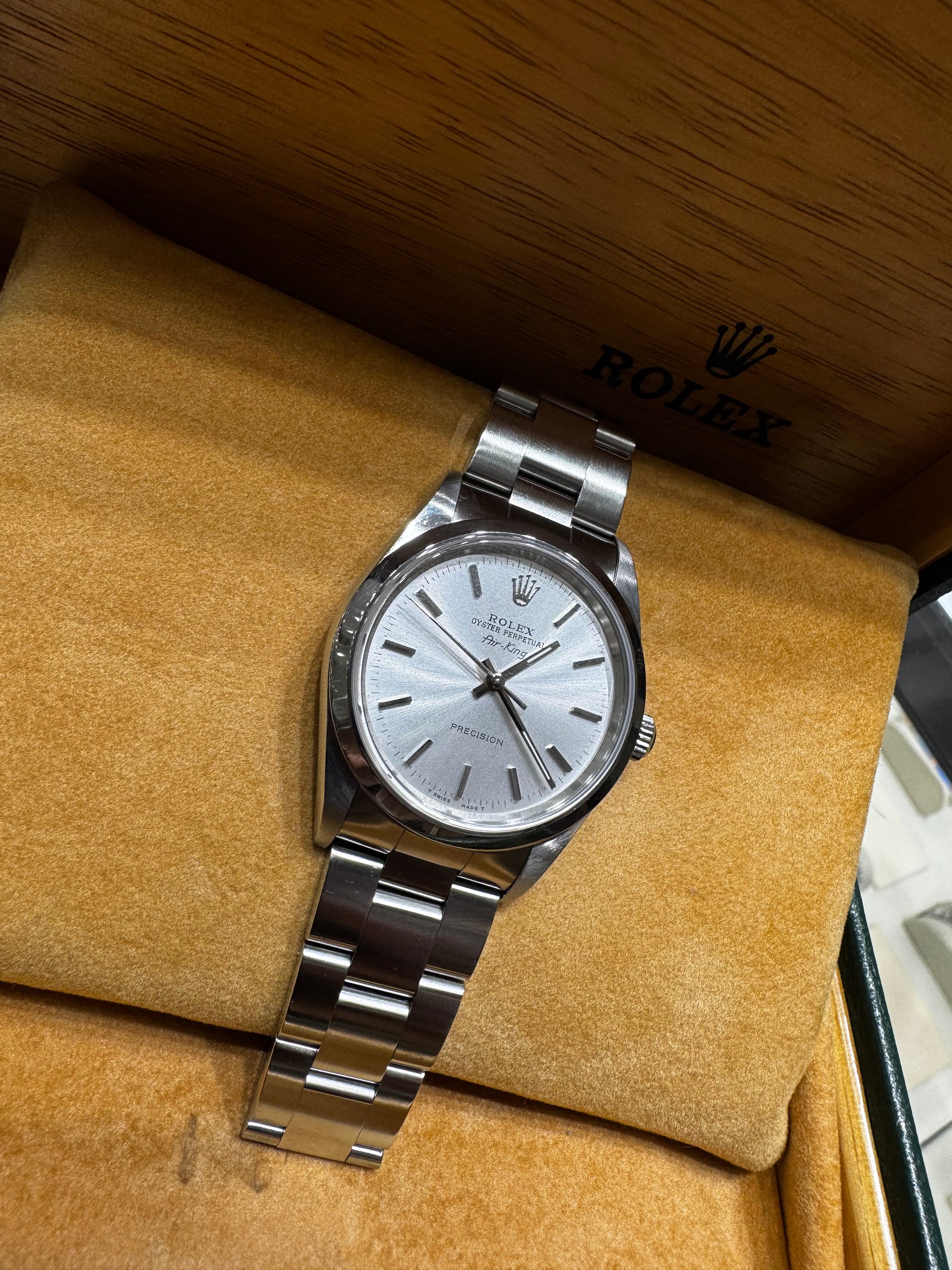 Pre-Owned Rolex Air King (14000) self-winding automatic watch, features a 34mm stainless steel case surrounding a blue dial on a stainless steel Oyster bracelet with folding buckle. Functions include hours, minutes and seconds.