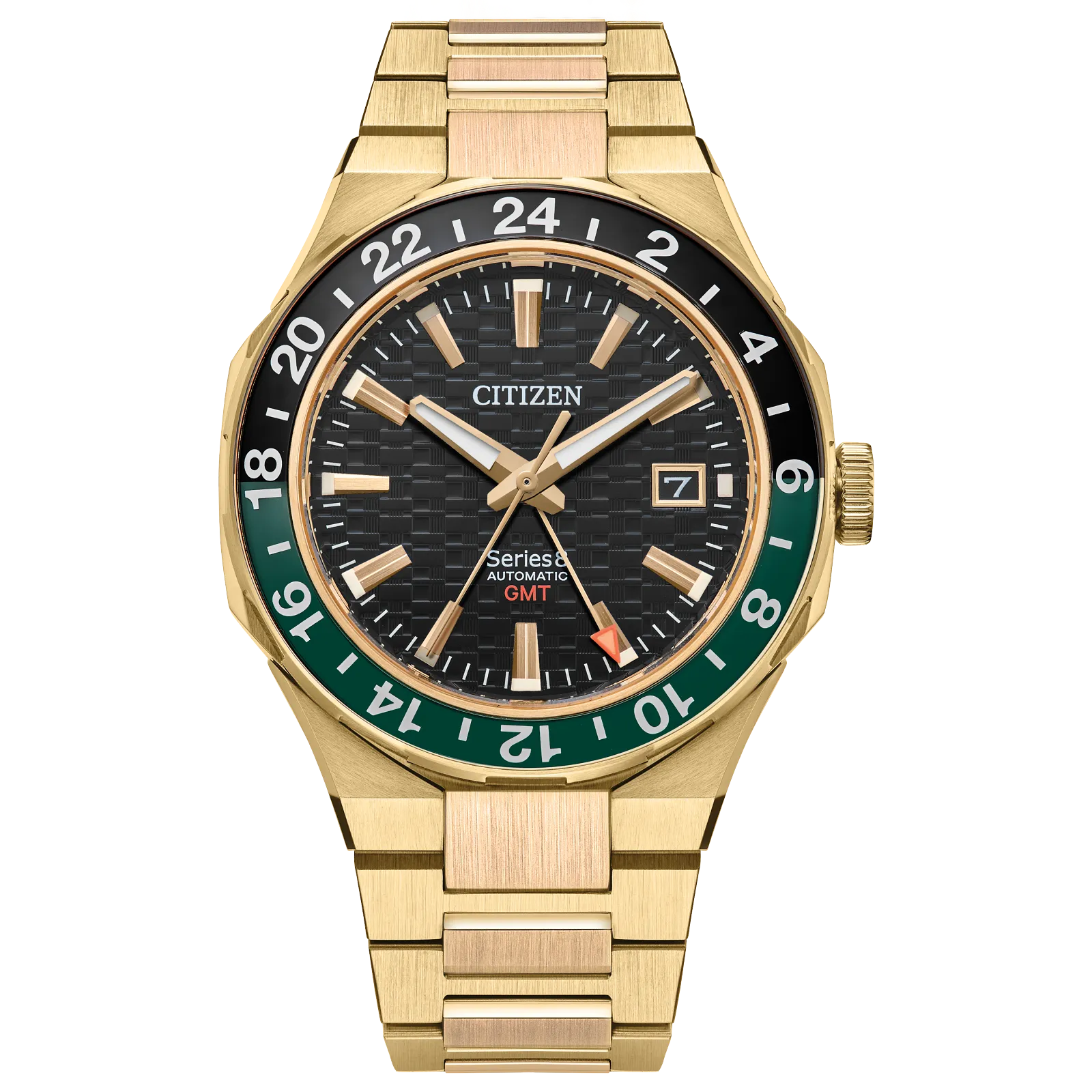 Functional and practical, modern and sporty –– the new Citizen Series 8 880 GMT is the perfect companion for daily wear to spirited travel and everything in between. Featuring a rose- and gold-tone stainless steel 41mm case with a black and green-tone bi-directional bezel, this timepiece highlights the best of Citizen's brushed and polished finishing techniques.