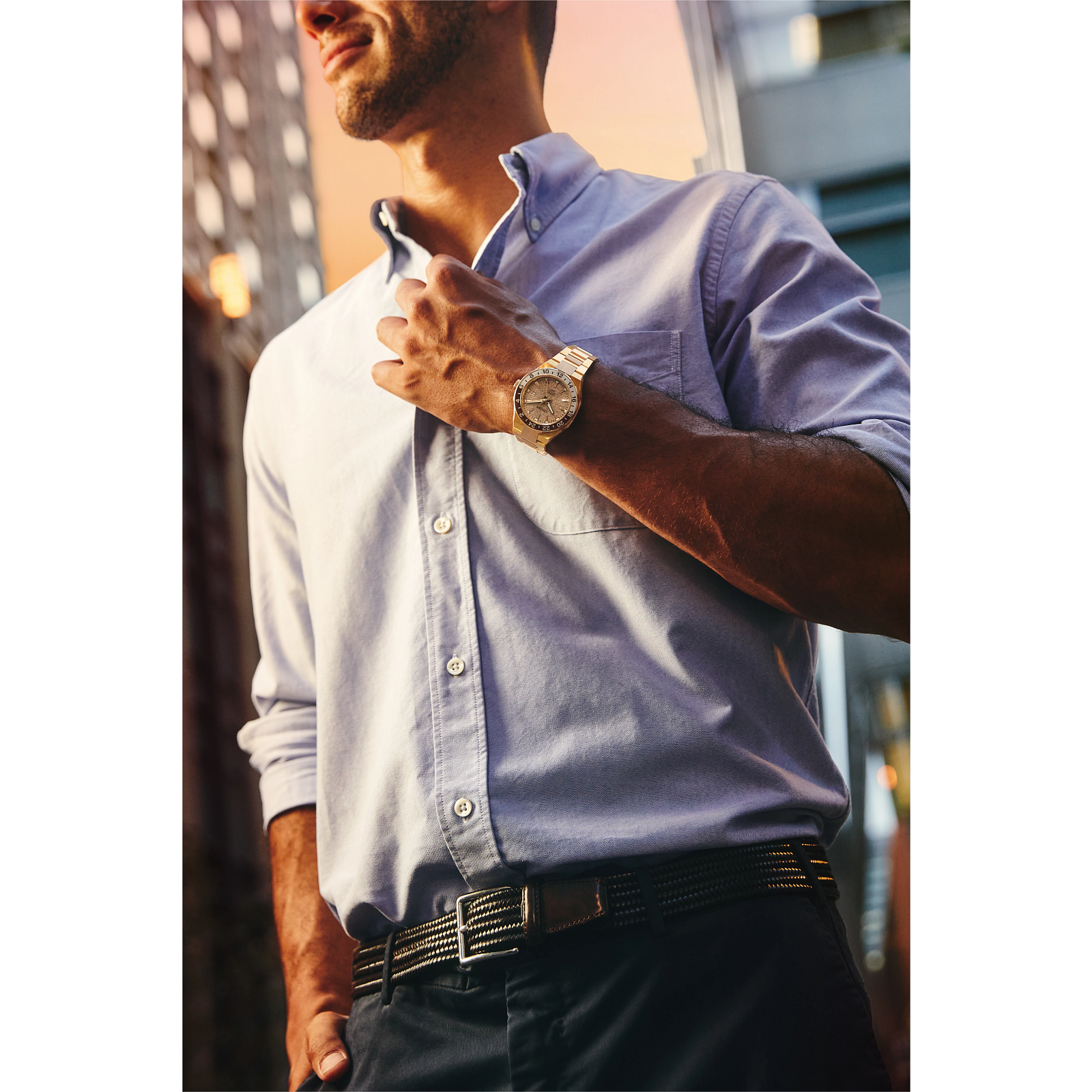 Functional and practical, modern and sporty –– the new Citizen Series8 880 GMT is the perfect companion for daily wear to spirited travel, and everything in between. Featuring a rose and yellow gold-tone stainless steel 41mm case with a brown and cream-tone bi-directional bezel, this timepiece highlights the best of Citizen's brushed and polished finishing techniques.