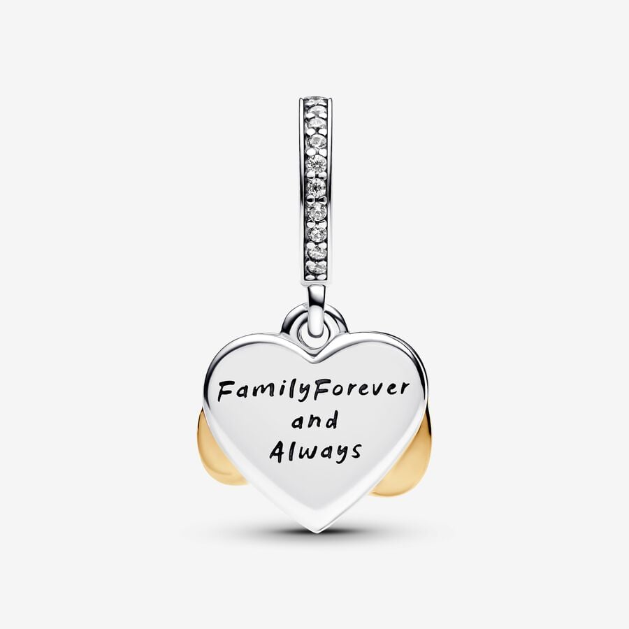 Take your love to infinity and beyond with this Sparkling Infinity Heart Dangle Charm. The front dangle is hand-finished in 14k gold plating, and features an infinity sign wrapped around a sparkling heart set with clear cubic zirconia. The back dangle’s pink hand-applied enamel provides a sweet backdrop to the love-filled message of the dangle charm with the engraving “Family forever and always”.