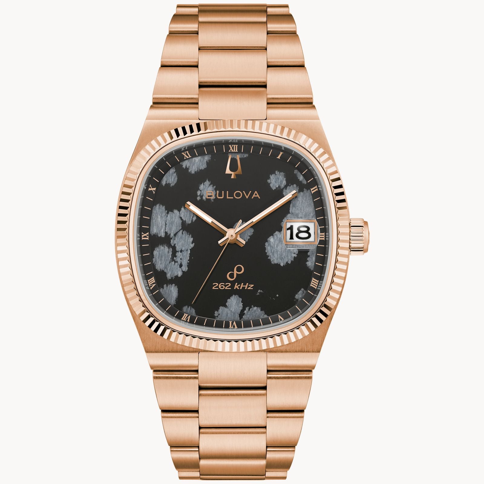 - A movement featuring a 3-pronged quartz crystal with a frequency of 262 kHz that is 8 times greater than standard quartz, leading to an accuracy of seconds a year.