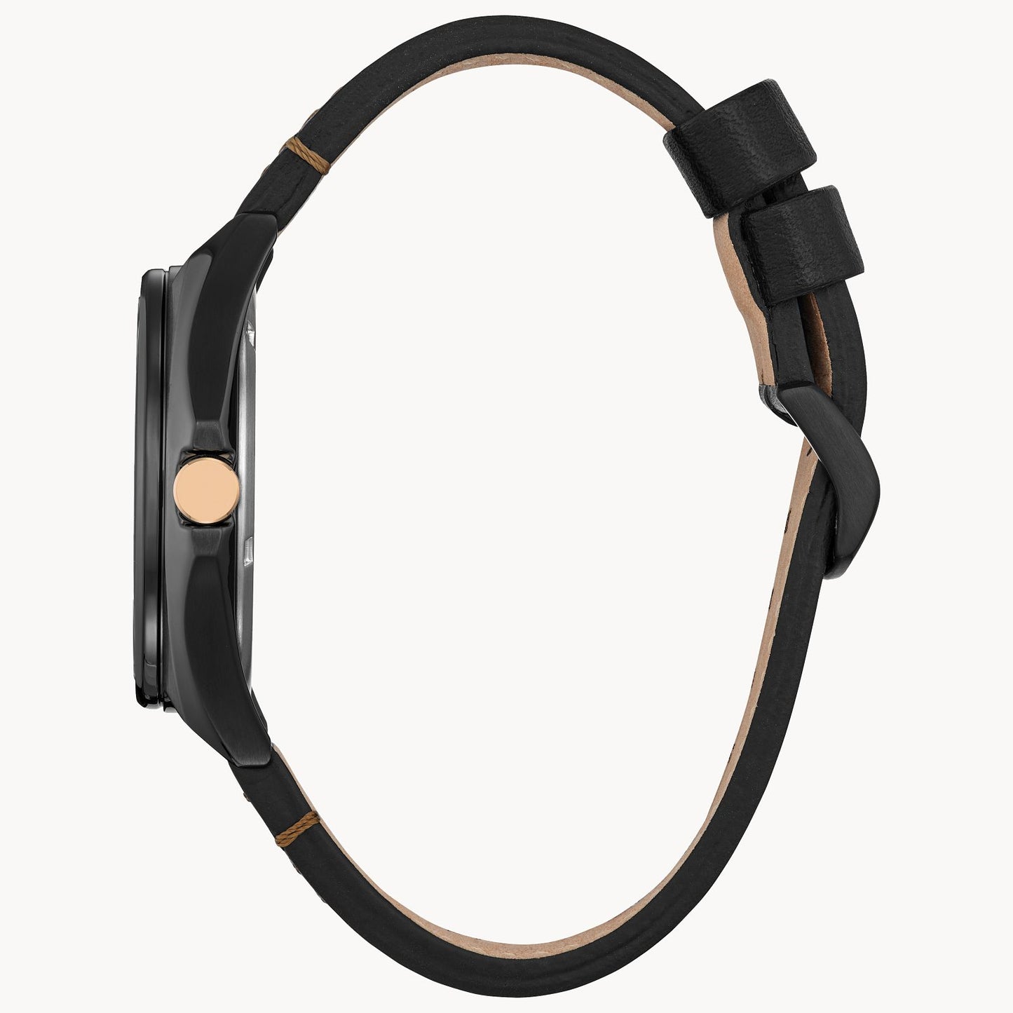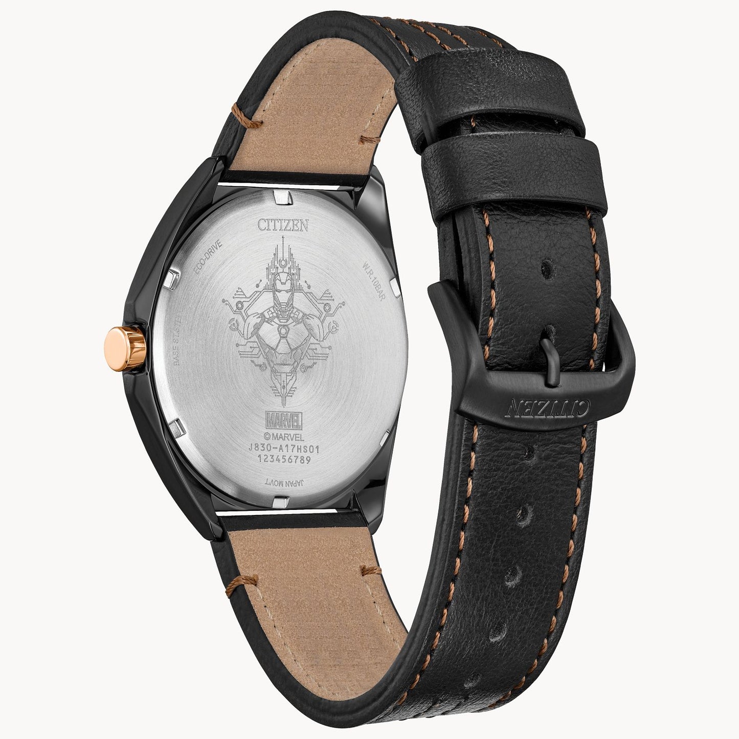 Sophistication fuses with technology in the latest Marvel’s Tony Stark timepiece from Citizen. Featuring the iconic shapes of the Arc Reactor on its dial, the action-ready watch reflects the Super Hero's ingenuity and the technological edge of Stark Industries on the wrist. With up to 100 meters of water resistance, this hardwearing timepiece is as robust in functionality as its design indicates. A geometric, black IP case and a matching black leather strap with contrast stitching secure the timepiece, while on the dial, gold-tone and fiery red details further channel Tony Stark's signature aesthetic and suit of Iron Man armor. Like the iconic power source in Iron Man's mechanized suit of armor, Citizen’s Eco-Drive technology drives the watch, ensuring its continuous and sustainable operation by making use of any light source to eliminate the need for a battery. © 2023 MARVEL
